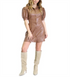 A Kit & Sky atualiza um estilo de gola com botões frontais, couro sintético e mangas bufantes para uma versão moderna de um clássico. | Ajustado no peito e na cintura; saia rodada e fluida | Gola pontuda; Silhueta ajustada e evasê | Fechos frontais com botões | Mangas curtas bufantes | Forrado
