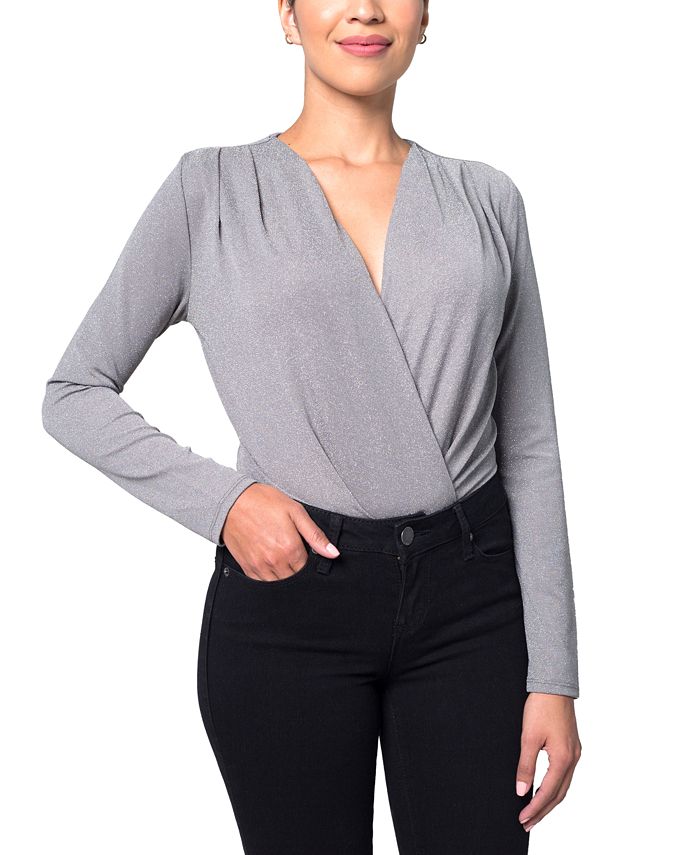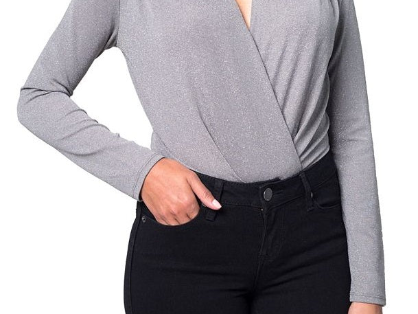 O body sofisticado da Kit & Sky brilha com a ajuda de fios metálicos. Este modelo com decote sobrepeliz é franzido nos ombros para um caimento elegante. | Calcinha com cobertura total | Decote sobrepeliz; fecho de velcro no reforço | Malha metálica drapeada | Nylon/fios metálicos/elastano; forro; poliéster/elastano | Lavável à máquina