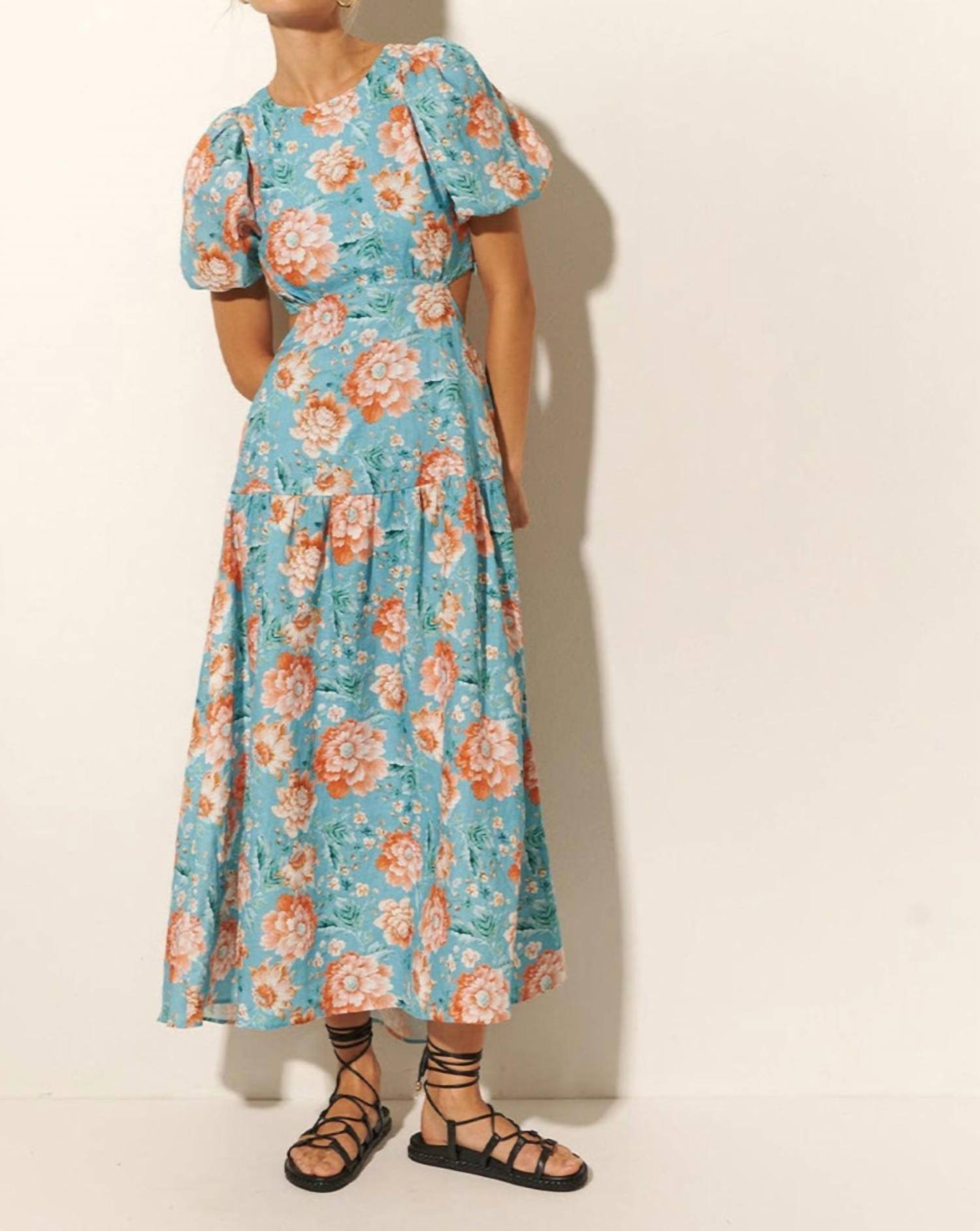 Style this maxi with your favorite statement necklace and sandals for the perfect look. Introducing the Josette Maxi Dress by KIVARI, a boho chic statement in blue floral. This A-line dress features short puff sleeves and an alluring cutout back with tie details for a flattering summer look. Made from 100% linen with an elasticated back waist, it offers both comfort and style. Closure: Tie closure. Care: Hand wash and lay flat to dry. Perfect for vacation getaways, this piece epitomizes relaxed elegance.