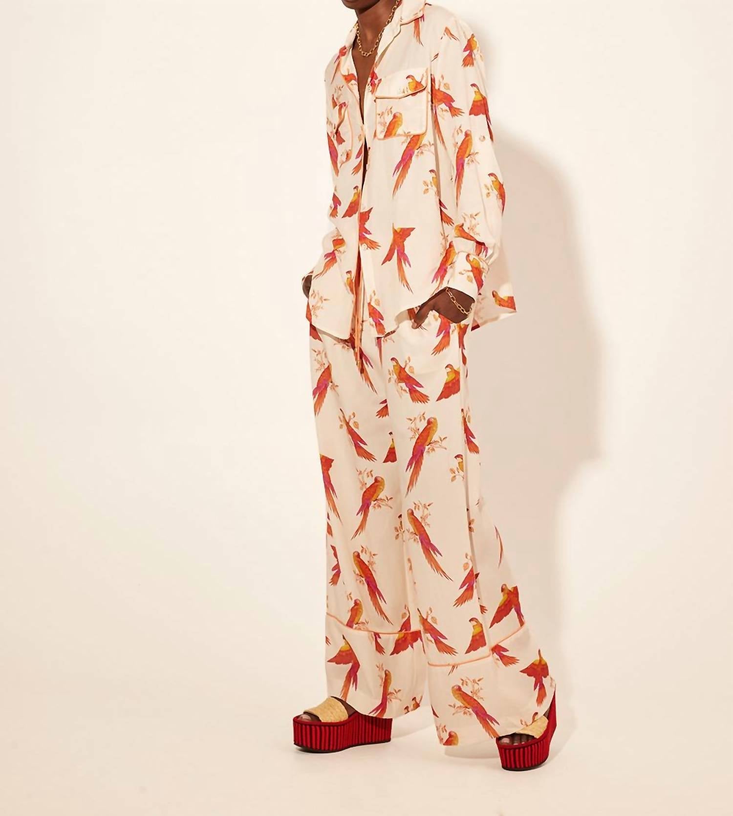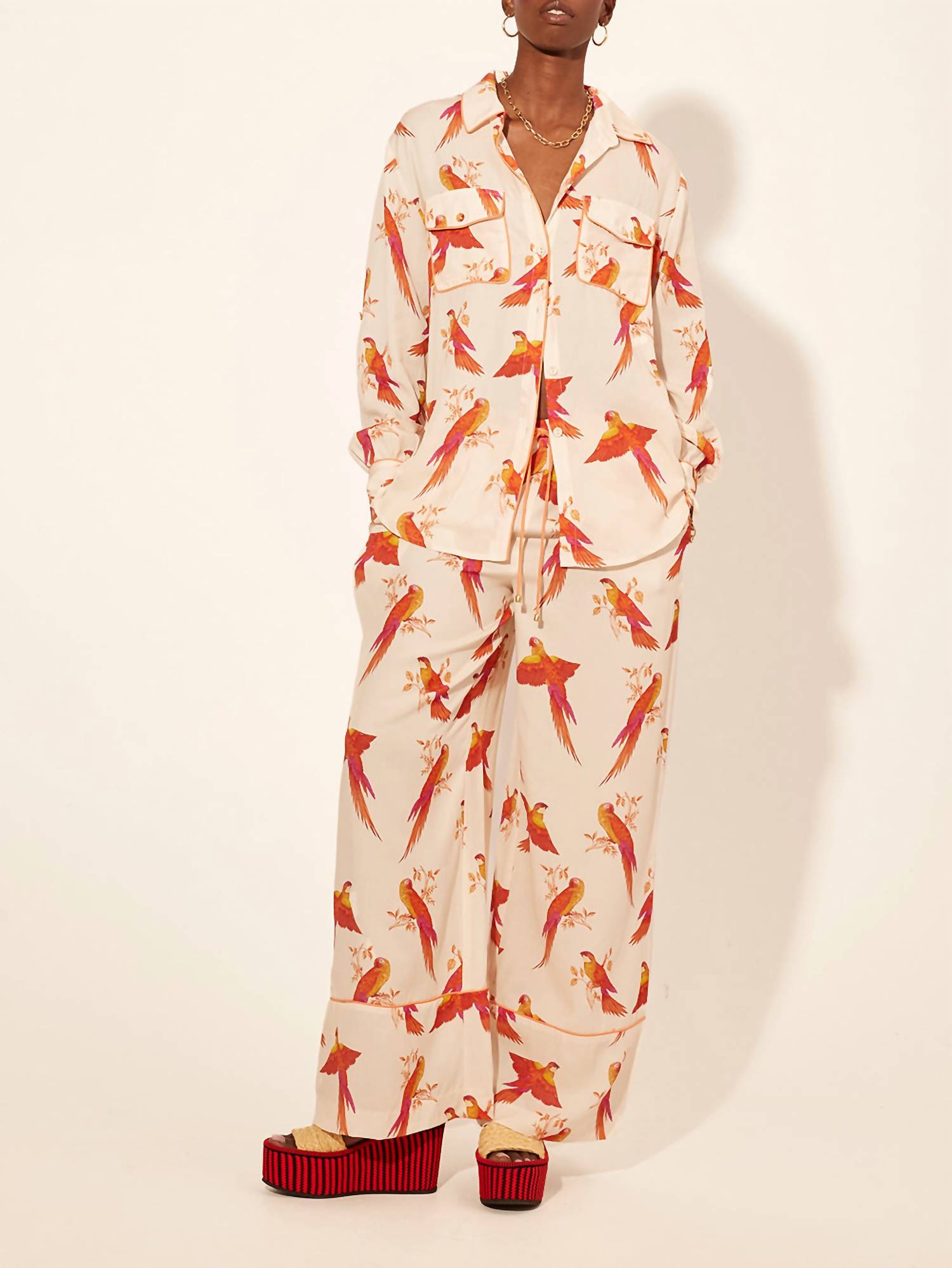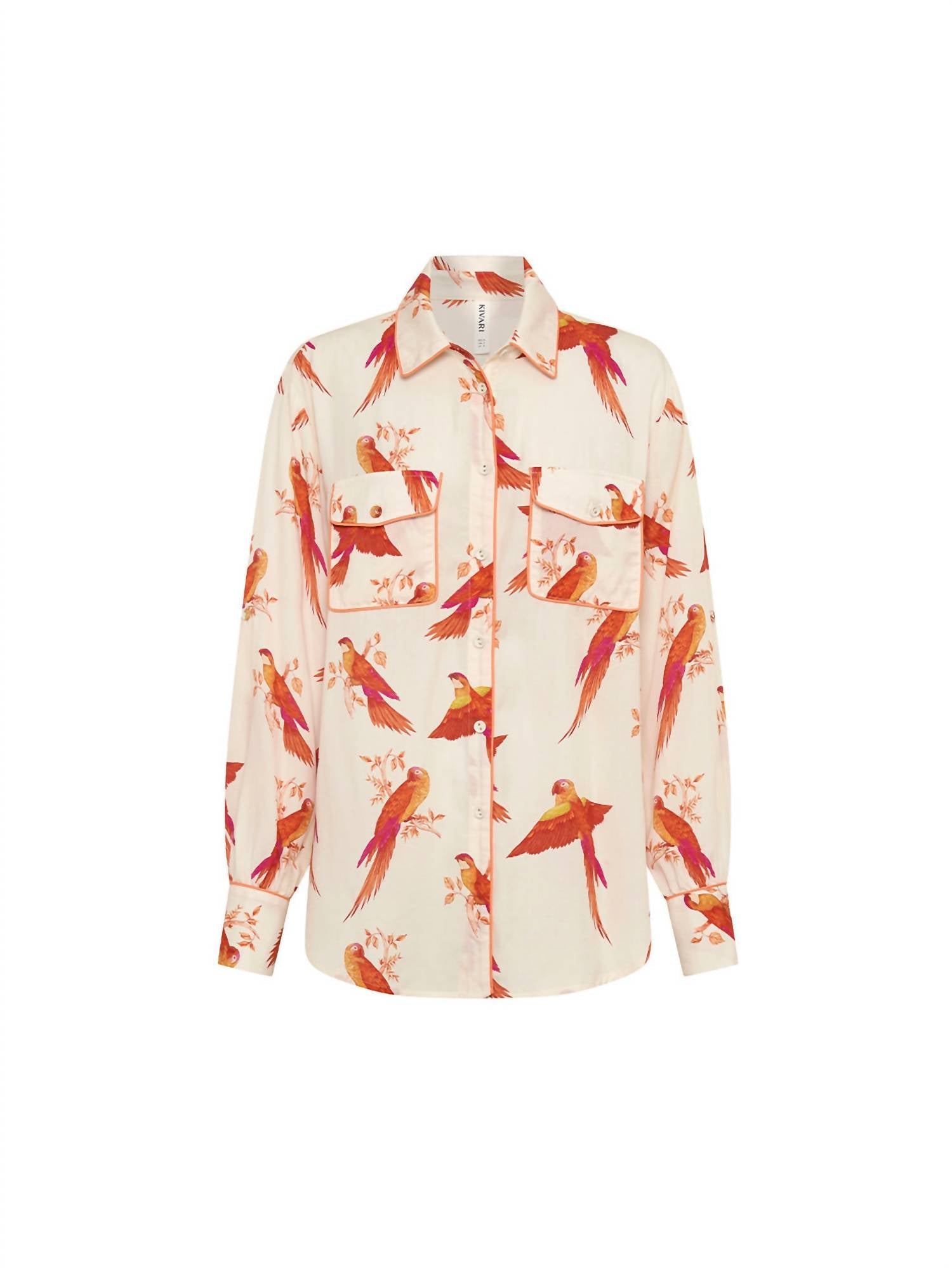 Discover the Kaylee Long Sleeve Shirt by KIVARI, a standout piece featuring a unique hand-painted design with birds in flight. This patterned shirt comes in a sophisticated beige hue, made from 100% Tencel, and designed with full-length sleeves, patch pockets, and contrast piping, epitomizing Boho Chic for the fall season. It features a collar neckline and a button closure, ideal for a housewarming occasion. Care is simple with hand wash and line dry instructions.