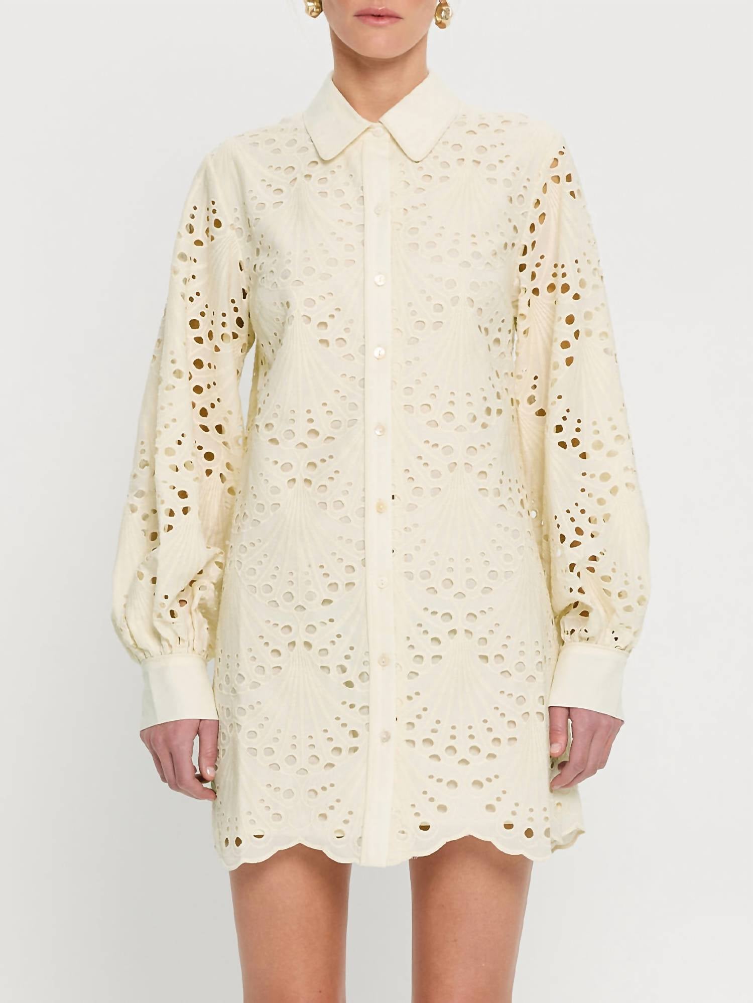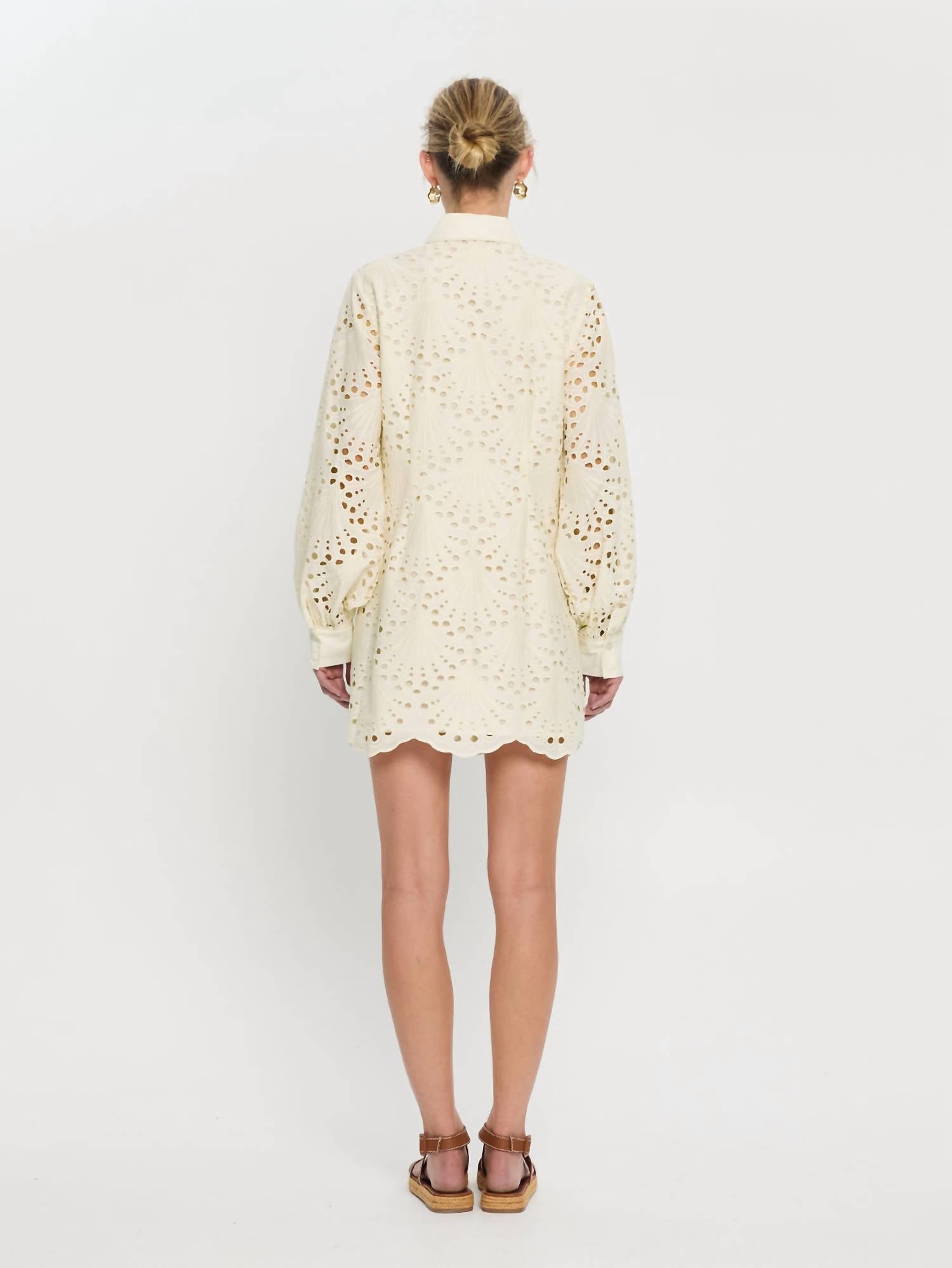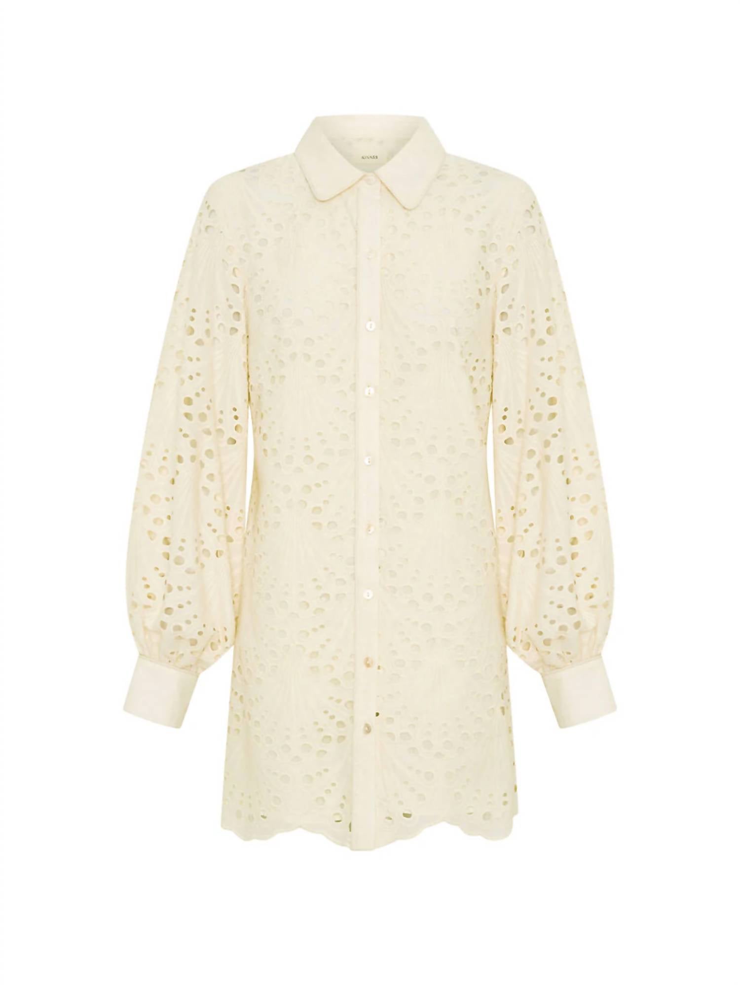 A short and breezy dress for those warmer days. The Piper Mini Shirt Dress by KIVARI in natural embraces timeless elegance with its allover broderie shell design, perfectly suited for a dinner party. This dress features long sleeves with tailored cuffs and a classic shirt silhouette, complete with a collar and signature shell button closure. Made from 100% cotton, it offers comfort and style without pockets, making it a sleek choice for Thanksgiving gatherings. For best results, dry clean only.