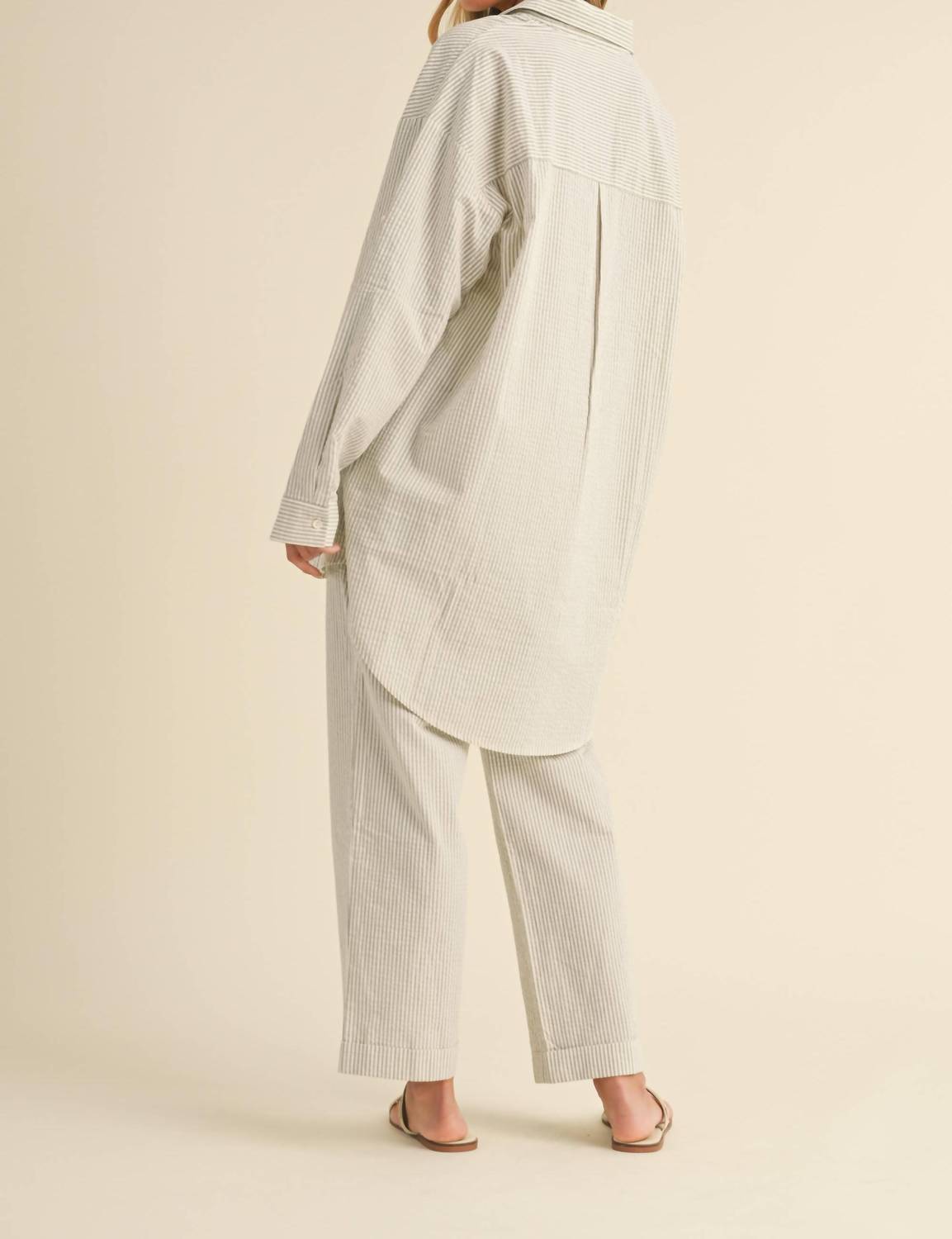 A set so cute you'll never want to take it off. Designed to look good while lounging, this little number is the perfect outfit for hanging at home in style. Introducing the Ali Long Oversized Shirt & Pants Set by Klesis, designed for effortless style in a sophisticated ivory stripe. This loungewear set features a long-sleeve button-down shirt with a comfortable boyfriend fit, paired perfectly with tapered relaxed fit pants. Composition: 80% Linen, 20% Polyester. Care: Machine wash and line dry for easy maintenance.