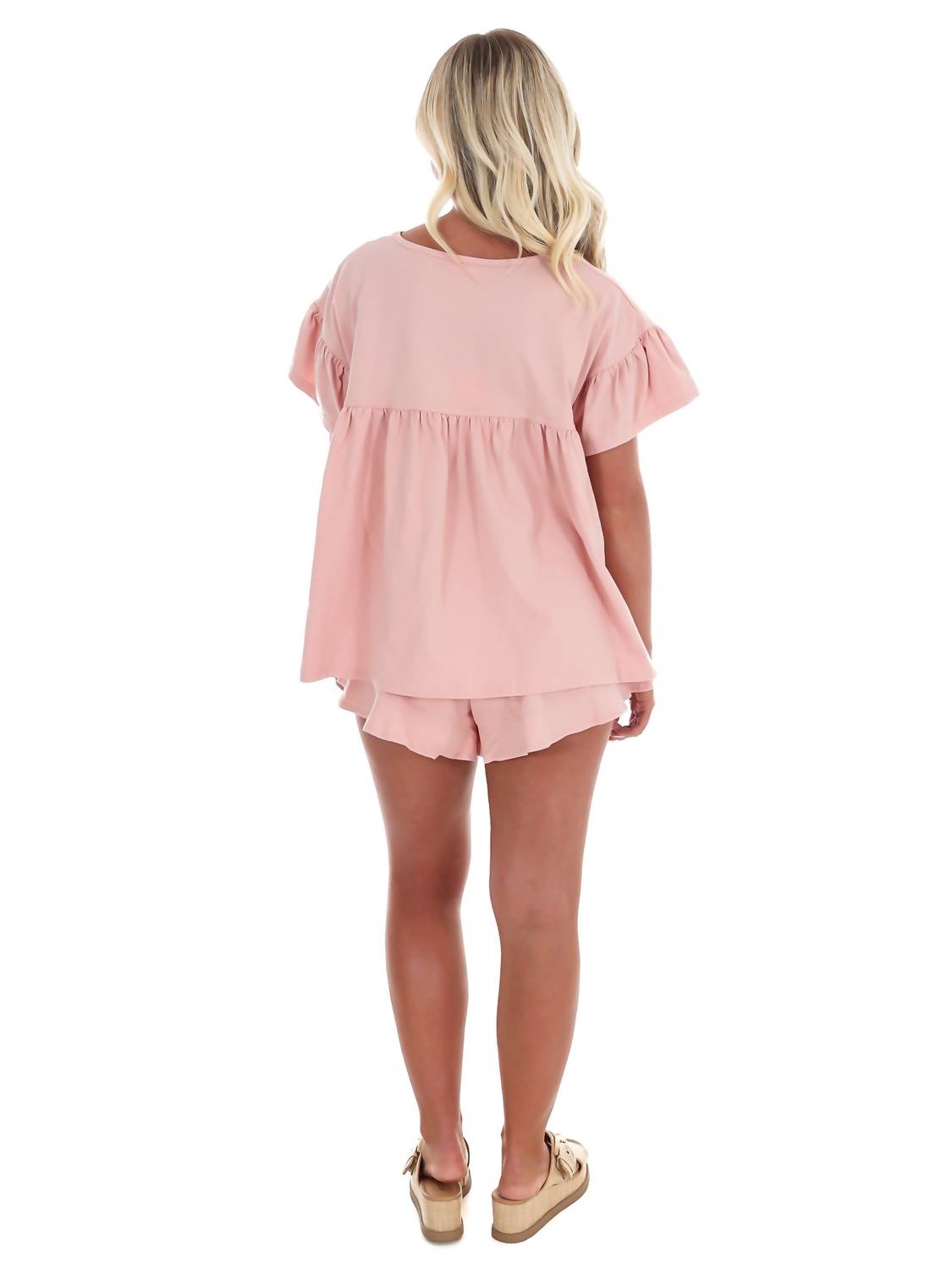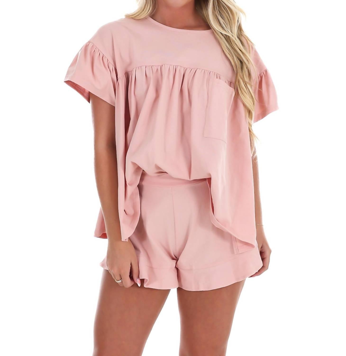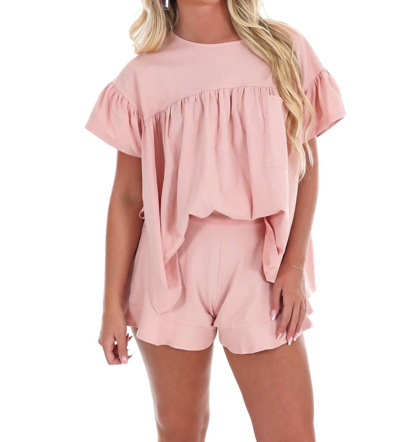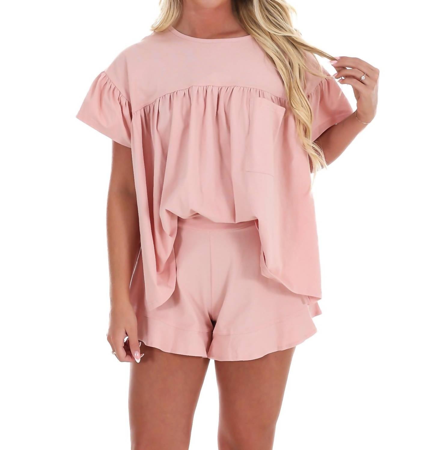 Um conjunto tão fofo que você nunca mais vai querer tirar. Desenvolvido para ser um charme no momento de relaxar, este pequeno item é perfeito para ficar em casa com estilo. Apresentamos o Conjunto de Duas Peças Sweet Melodies da Klesis, um complemento perfeito para o seu guarda-roupa de férias de primavera. Este conjunto loungewear em cor lilás lisa apresenta um top babydoll túnica plissada de manga curta com gola redonda e shorts com babados para um look chique e confortável. Projetado com um estilo minimalista em mente, as fendas laterais aprimoram sua experiência ao ar livre, enquanto um prático bolso frontal adiciona praticidade. Ideal para um visual estiloso e descontraído, este conjunto é um item essencial para a estação.