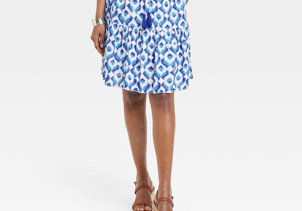 Design com estampa Ikat azul | Corte em A em camadas | Comprimento da minissaia | Cintura alta elegante | Cós elástico | Tecido leve e respirável | Uso casual ou formal versátil | Ajuste confortável | Adequado para várias estações | Disponível no tamanho pequeno