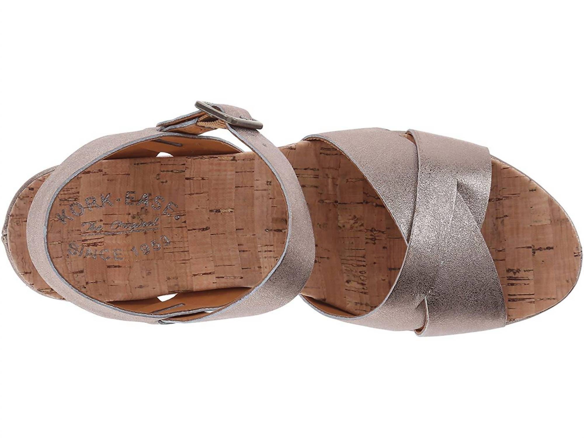 Step into summer with the Women's Ava 2.0 Wedge Sandal by KORK-EASE, a perfect blend of boho chic and casual elegance in a stunning gold hue. These wedges boast a genuine leather upper and an open toe design, ensuring breathable comfort. The platform and mid-height wedge heel provide both style and support, while an adjustable buckle closure secures your fit. Finished with a cushioned cork footbed and durable rubber sole, these imported sandals are designed for laid-back vacations and sunny days.