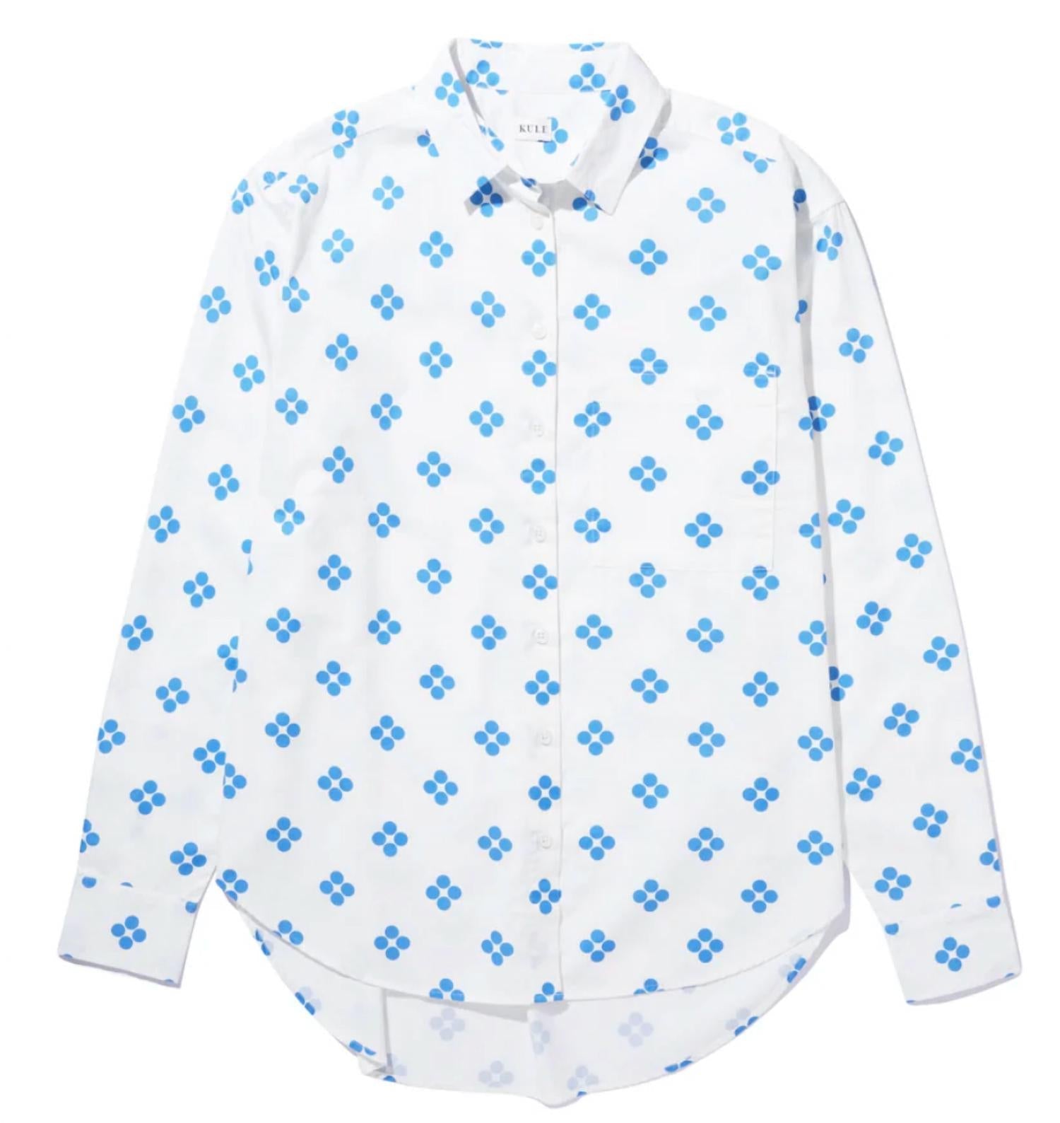 Introducing the Quinn Shirt by KULE, a stylish button-down crafted from 100% cotton for ultimate comfort. This piece features long sleeves and a collar, perfect for a polished look with its white and royal blue colorway. Designed with a slightly longer back hem for a relaxed and effortless fit. Machine wash. Ideal for any wardrobe staple, effortlessly combining style and practicality.