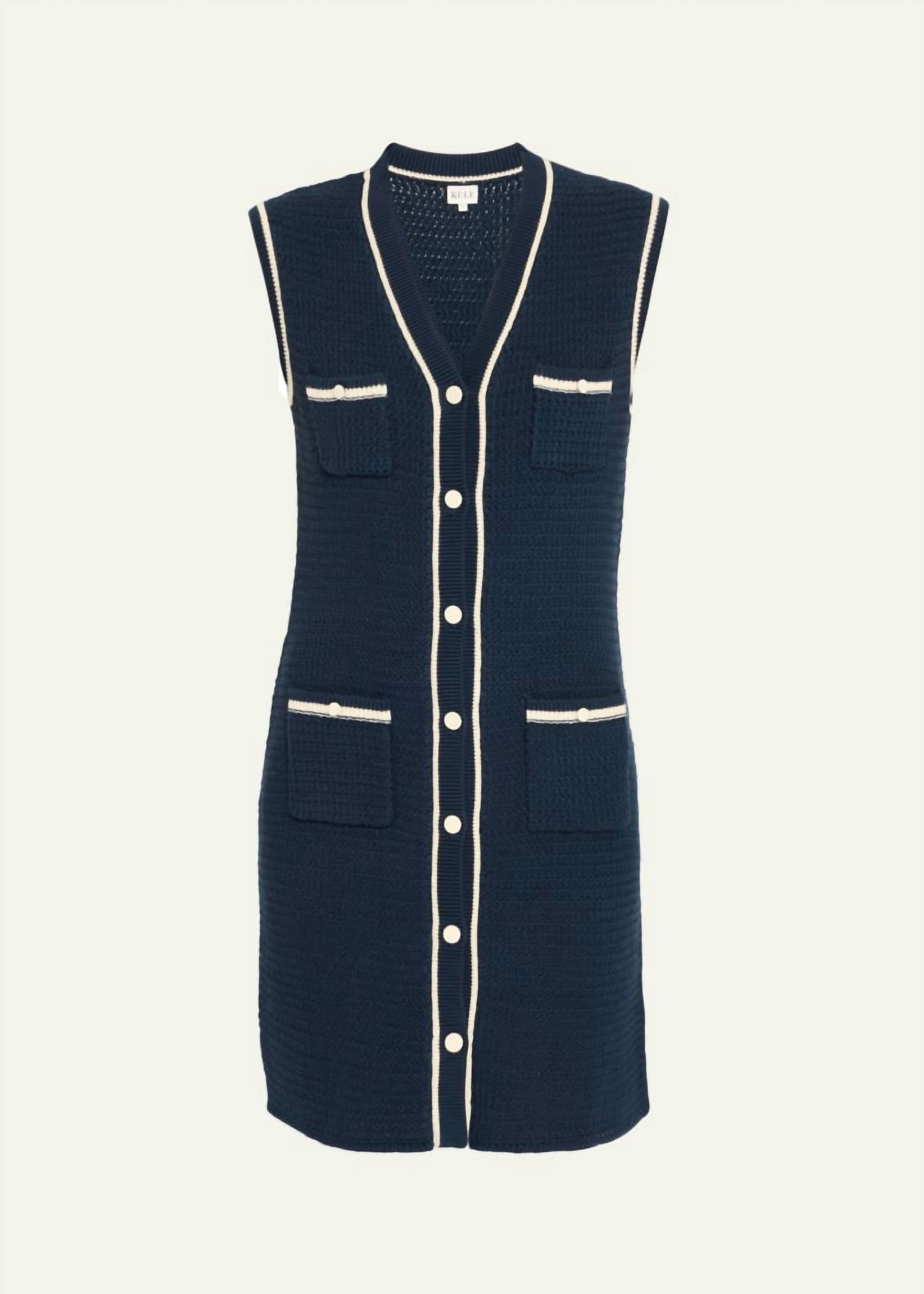 The kind of easy and flattering dress you'll be reaching for all season long. Introducing the Virginie Dress by KULE, a chic and stylish option in a navy cotton blend with a sleek shirt silhouette. This sleeveless mini dress, crafted from 95% cotton and 5% spandex, offers a fitted shape and flattering V-neckline. It features a button closure and the practicality of four pockets. Made with care and imported, this garment should be dry cleaned only for best results and measures 33 inches in length (size S).