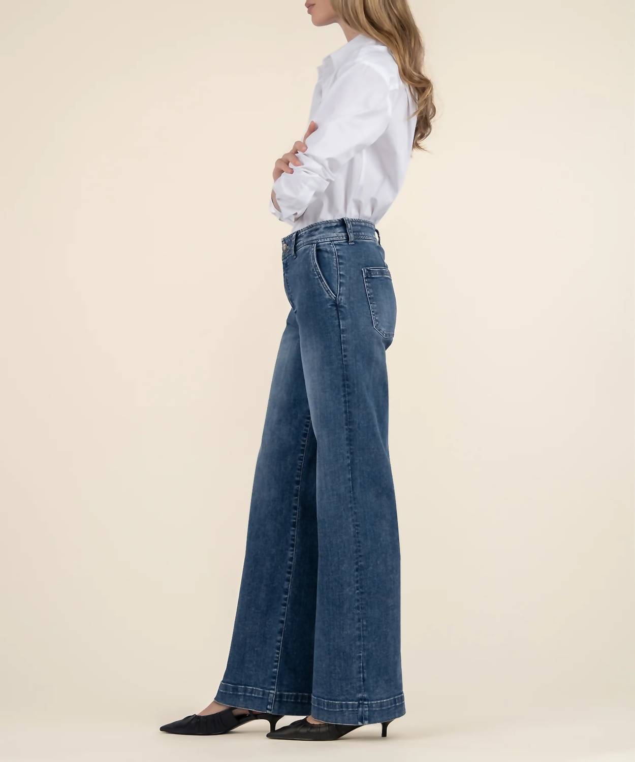 Abrace a elegância moderna com a calça jeans de cintura alta e perna larga da KUT FROM THE KLOTH, um destaque em jeans com lavagem base escura. Esta calça jeans oferece um caimento alto com um estilo descontraído de perna larga, realçado por bolsos frontais tipo faca e fecho de botão. A composição do tecido inclui 96% algodão, 3% poliéster e 1% elastano para um ajuste confortável e flexível. A costura interna mede 81 cm, com uma abertura de perna de 56 cm e um comprimento de 28 cm. Para cuidados, lave na máquina com água fria, do avesso, com cores semelhantes, e seque em temperatura baixa, ou deixe secar na horizontal para melhor conservação. A modelo tem 1,78 m e veste tamanho 0 (cintura 61 cm, quadris 94 cm).