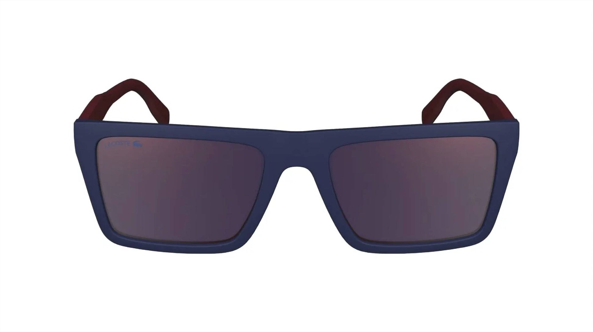 Introducing the Men's L6009s Sunglasses by Lacoste, a stylish choice for any modern wardrobe. With a matte blue full rim frame crafted from durable plastic, these sunglasses boast a rectangle shape that's ideal for heart, oval, and round face shapes. They feature a lens width of 56 mm, bridge width of 19 mm, and a temple length of 145 mm, with violet plastic lenses offering Category 3 UV protection. Perfect for those seeking both form and function in their eyewear.