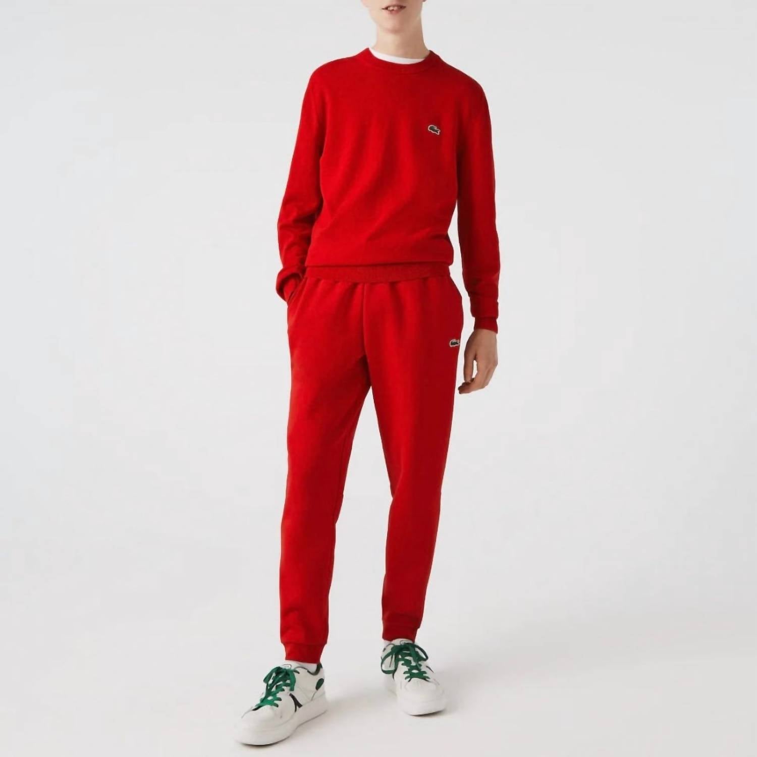 Trackpants in vibrant green. Designed for men, these solid-color joggers feature a pull-on closure and a tapered leg style, enhancing your silhouette with ribbed ankles. Made from a blend of 84% organic cotton fleece and 16% recycled polyester, these trackpants are crafted to be sustainable and durable. While practical pockets add functionality, the embroidered signature crocodile ensures standout Lacoste performance.