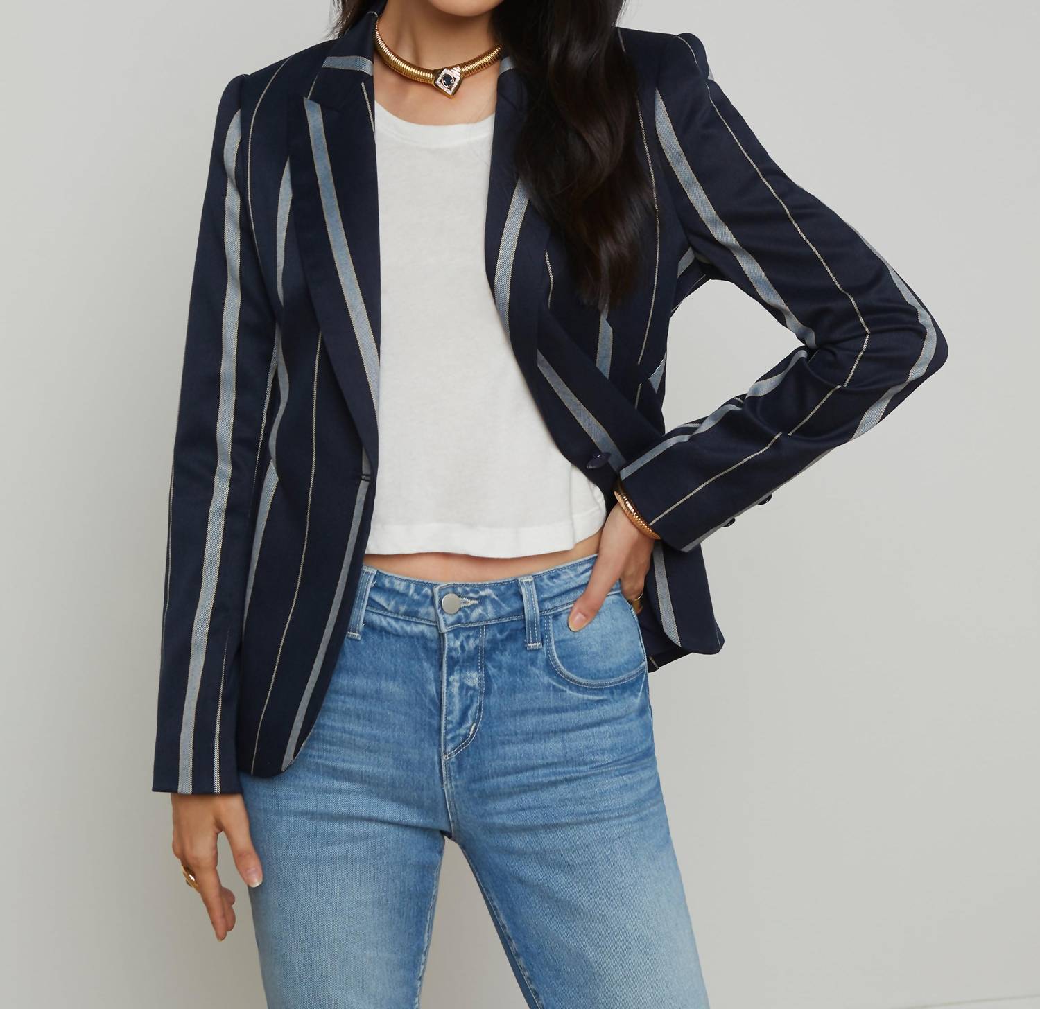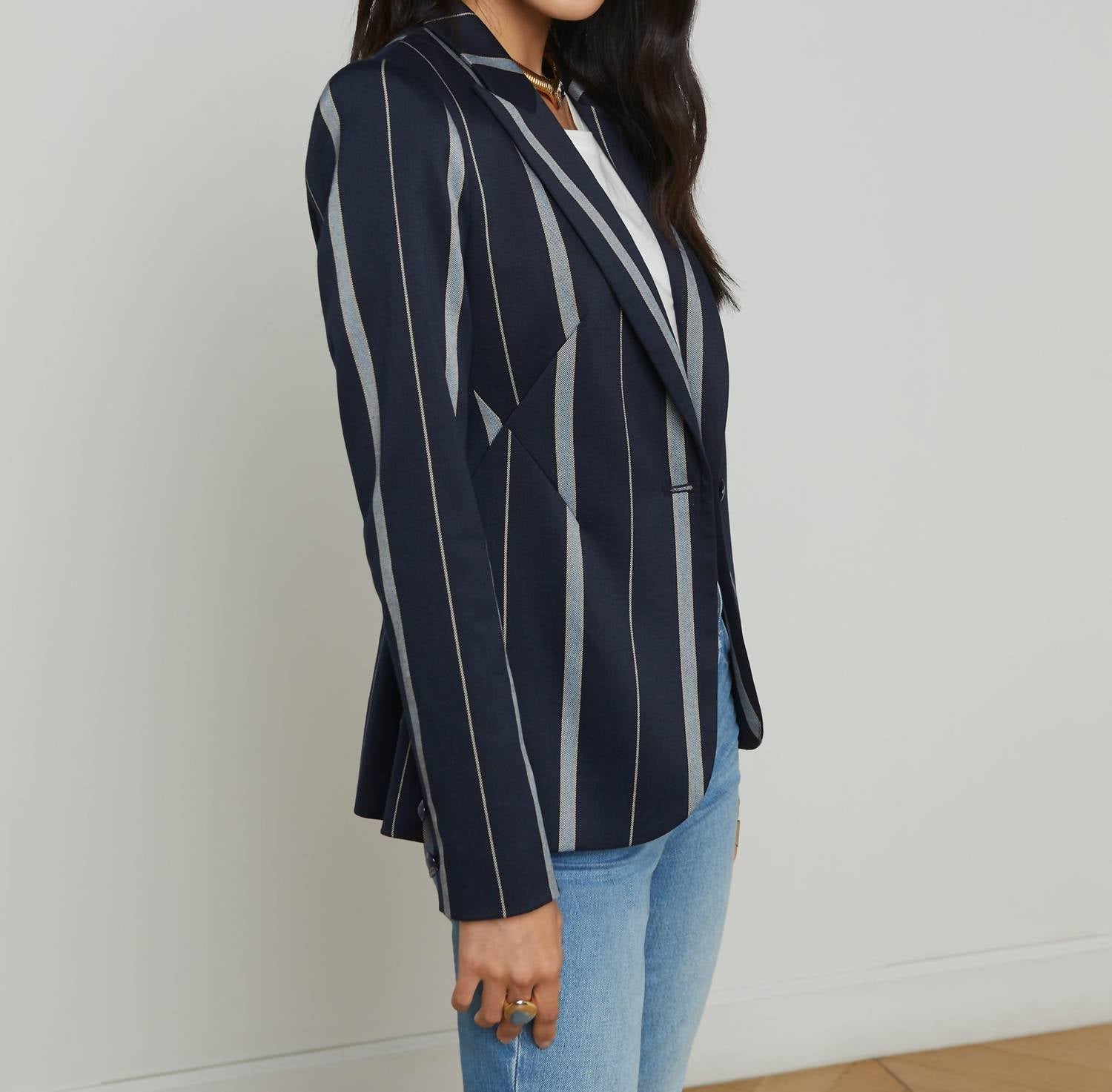 Introducing the Clementine Jacket by L'Agence, a sophisticated piece in a striking Midnight Multi Stripe for women. Featuring long sleeves and a classic collar, this blazer is crafted from quality polyester. Its button closure ensures a tailored fit. Care: Dry clean and line dry for lasting elegance.