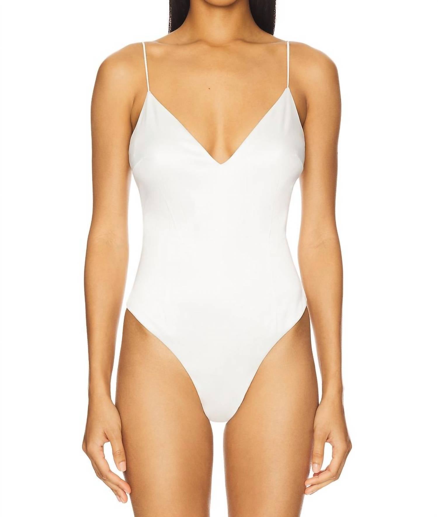Form fitting and comfortable - this bodysuit check all of the boxes. Introducing the Dara Plunge Neck Bodysuit by L'Agence, an elegant piece crafted in lustrous satin with spaghetti straps and a flattering V-neck. Designed in a solid ivory hue, this bodysuit is approximately 24 inches from shoulder to bottom and features an invisible back zip for a seamless look. Composition: 98% Polyester, 2% Elastane. Care: Dry clean only. Model is wearing size XS (5'9" height, 32" bust, 24" waist, 34" hip).