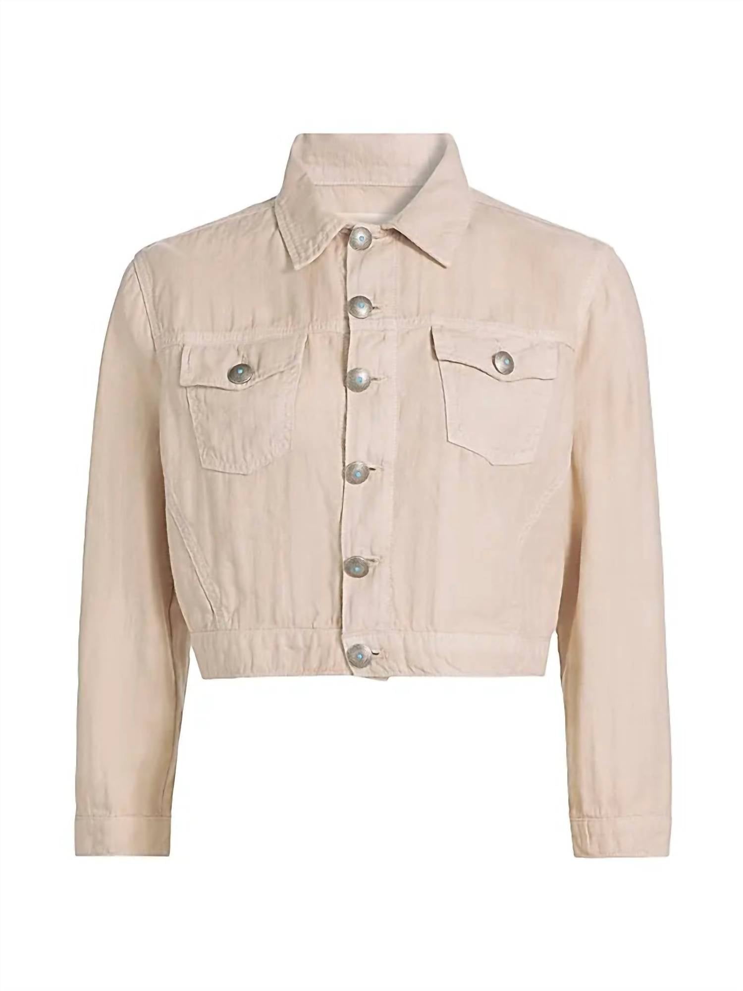 The Koda Coated Cropped Jacket by L'AGENCE brings a touch of elegance with its long sleeves adorned with button barrel cuffs. Crafted from a textured linen and cotton blend, this French Vanilla piece features a cropped silhouette and ornate button details. The jacket includes chest button-through flap-patch pockets and a button-front closure, perfect for a stylish vacation look. Composition: 100% Cotton. Care: Machine wash.