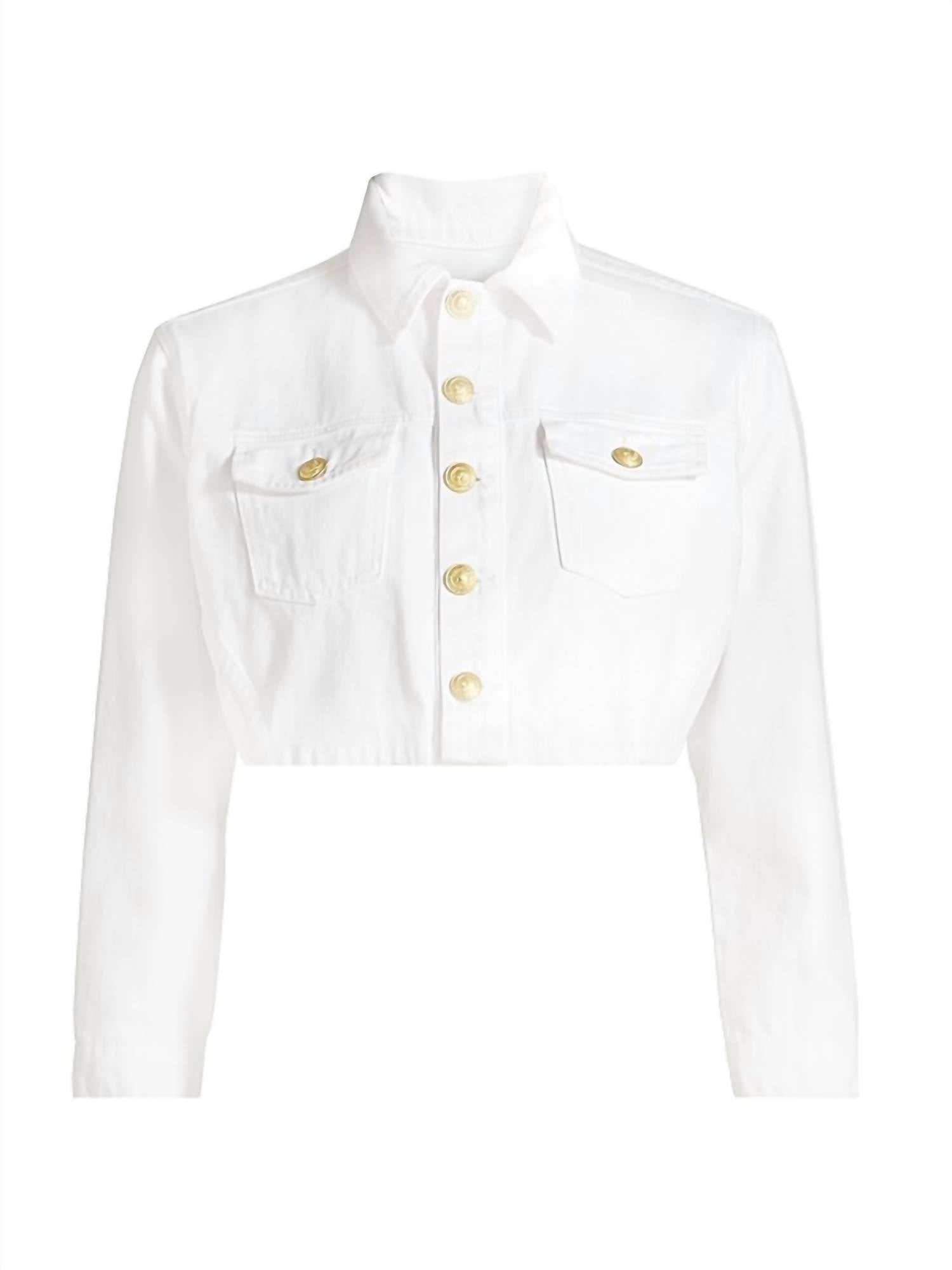 Classic, cool and works with almost any outfit choice. The Koda Cropped Jacket by L'Agence is a chic addition to any wardrobe with its timeless solid blanc design. This women's jean jacket features long sleeves with button cuffs, a collared neck, and flap breast pockets for a sophisticated touch. Crafted from 100% cotton, it boasts a garment length of 17.25 inches and is made in the USA from imported materials. The button closure and requirement for dry cleaning ensure both ease of use and care.