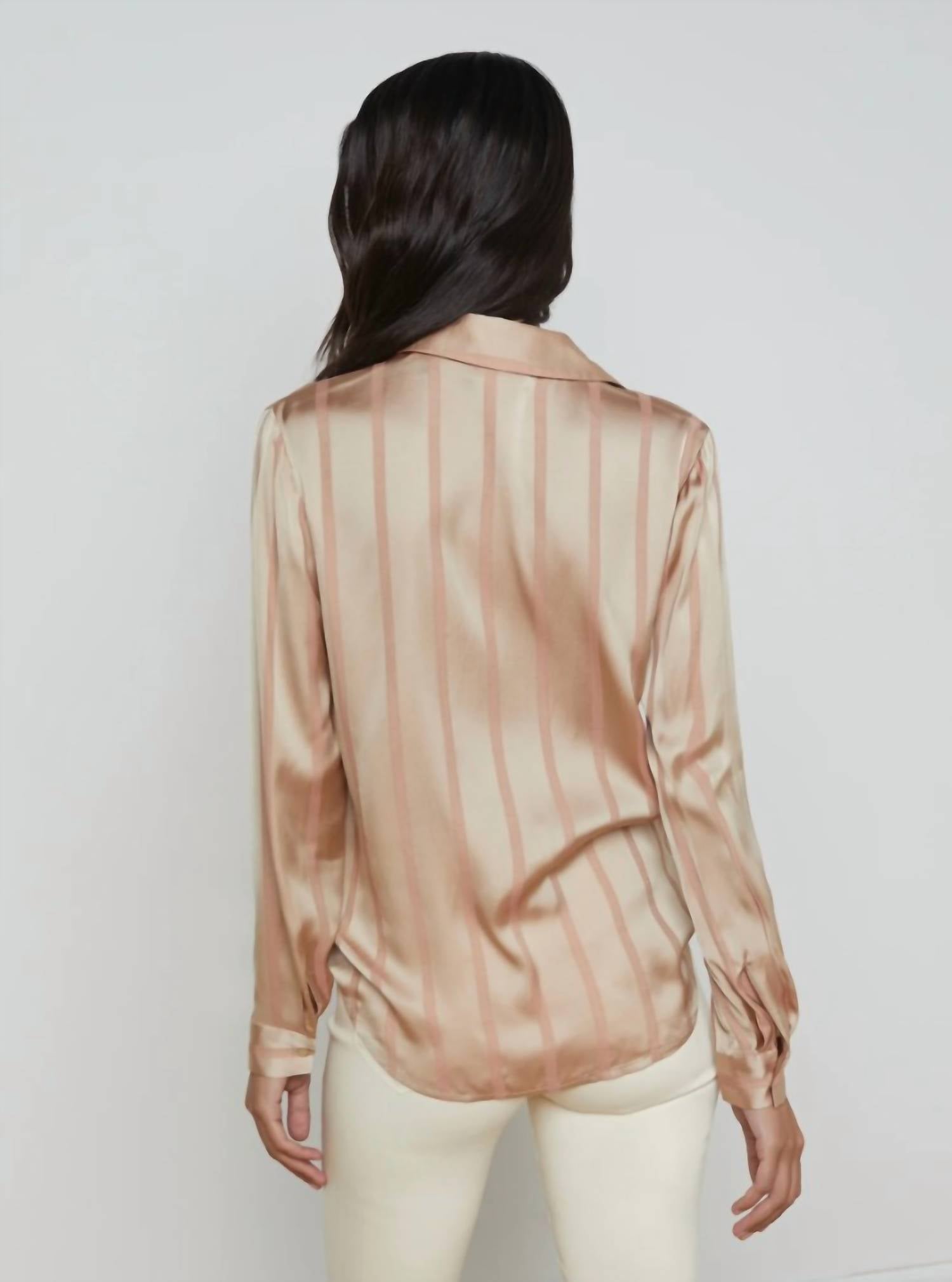 A classic button down shirt that will never go out of style. Introducing the Laurent Blouse by L'Agence, a sophisticated addition to your wardrobe. This women's long sleeve top features a striking champagne stripe pattern on a luxurious viscose blend satin for a relaxed, elegant fit. Designed with a classic collar neckline and a front button closure, it embodies timeless style perfect for workwear or vacation occasions. Patterned in champagne stripes, this top effortlessly combines contemporary flair with classic elements.