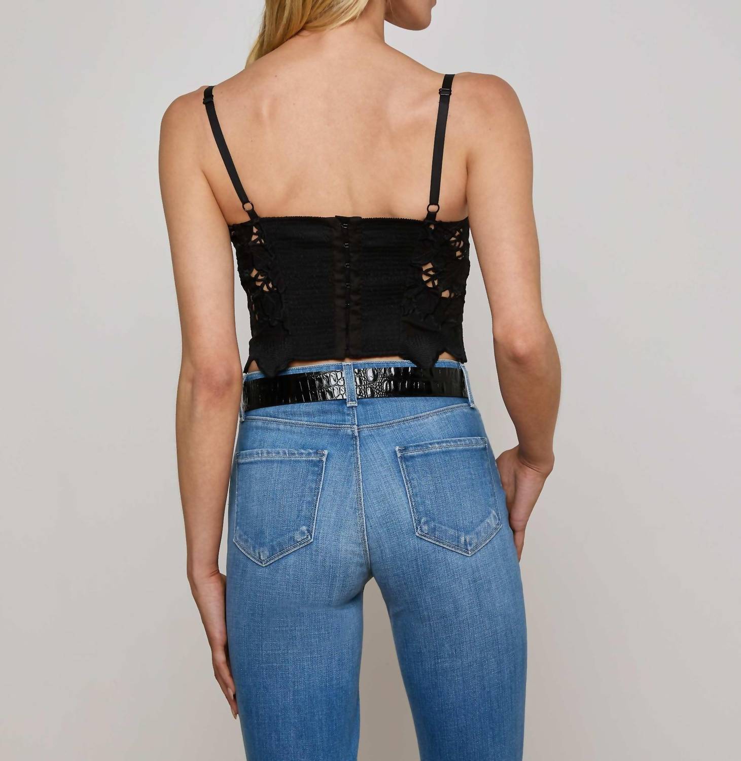 Fit, fabric and functionality. This tank top checks all the boxes. Introducing the Sonya Eyelet Bustier by L'Agence, a captivating piece in classic black that exudes elegance. This bustier features spaghetti straps and is crafted from 100% cotton for a luxurious feel. The structured cups with underwire and a smocked back ensure a perfect fit, while the delicate floral embroidery adds a feminine touch. Closure: Hook and eye at the back. Care: Hand wash gently in cold water, line dry, do not bleach or wring, cool iron if needed.