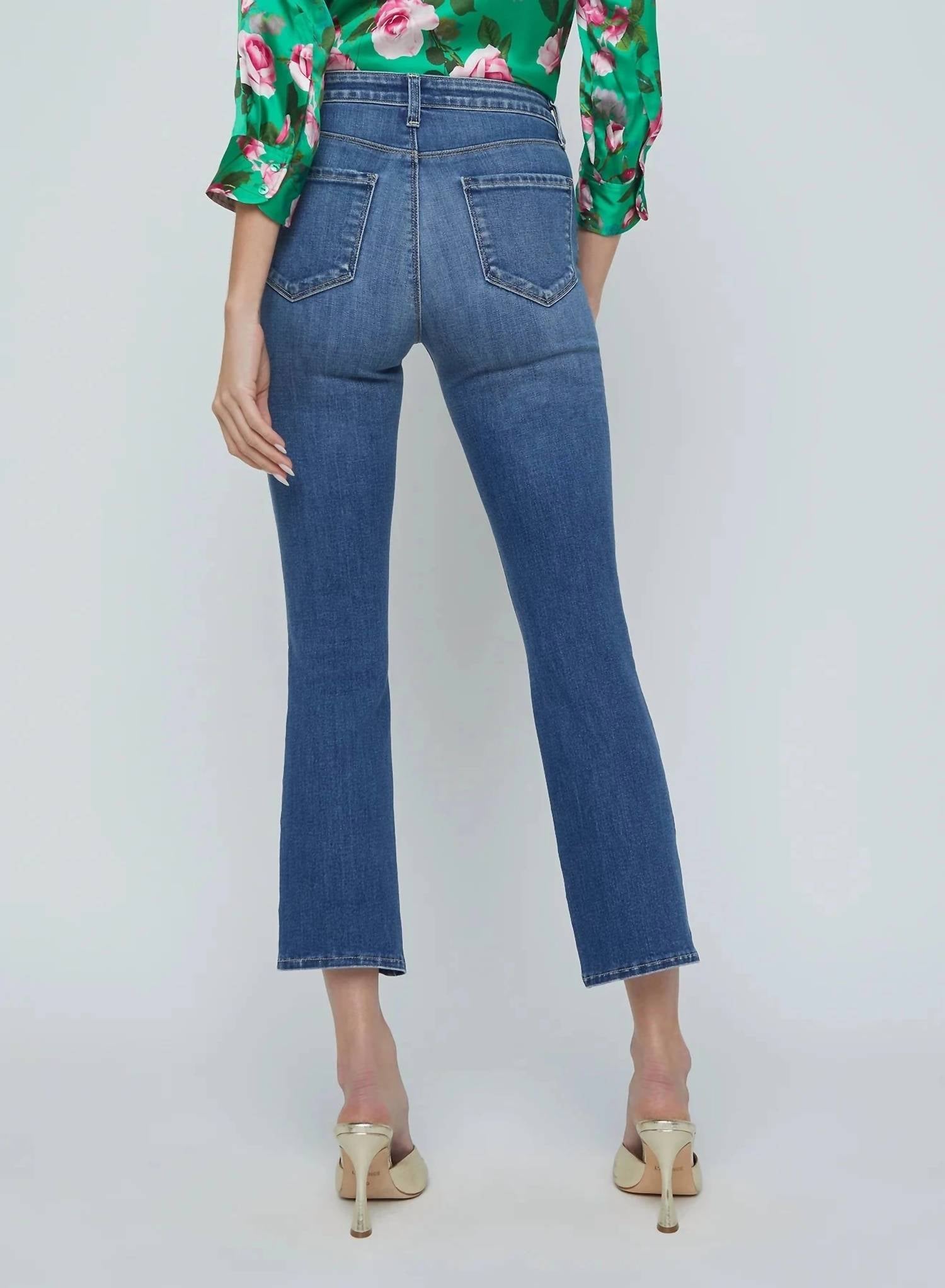 High-waist is here to stay and we especially love this style. Elevate your denim collection with the Tati High Rise Micro Boot Jeans from L'Agence, expertly crafted in a medium wash Alverez color. Boasting a high-rise fit and a cropped micro-bootcut leg, these jeans are constructed from a cotton blend featuring 94% cotton, 5% polyester, and 1% spandex to ensure comfort and style. This premium stretch denim showcases a 5-pocket design with a convenient zip fly and button closure. Made in Los Angeles, the jeans feature a 9.75" rise, 27" inseam, and 15.5" leg opening, and are machine washable and safe for tumble drying. Model is wearing a size 25 at 5'9" height, 32" bust, 24" waist, and 34" hips.