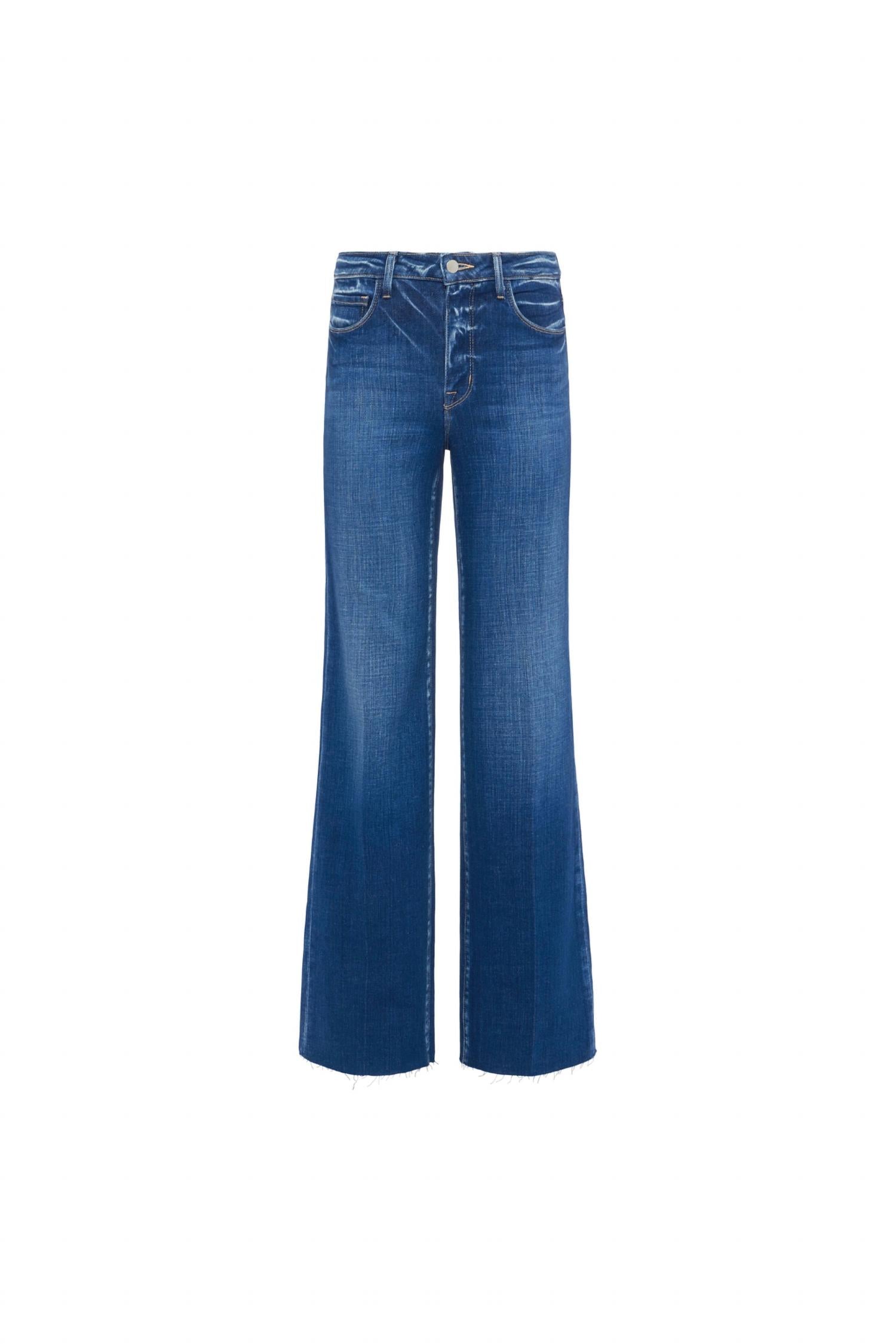 Elevate your evening look with L'Agence's Scottie High Rise Wide Leg Jeans in Desoto, a stylish choice for any dinner party. This premium stretch denim pair boasts a flattering fit through the hips and features a high-rise, wide-leg silhouette with a contoured waistband that prevents gaping. Composition: 94% Cotton, 5% Polyester, 1% Spandex. Closure: Front zip-fly with button closure. Constructed in the US from imported materials. The model is 5'10", with measurements of 32" bust, 24" waist, and 34.5" hips, wearing size 25. Rise: 10", Inseam: 32", Leg Opening: 20".