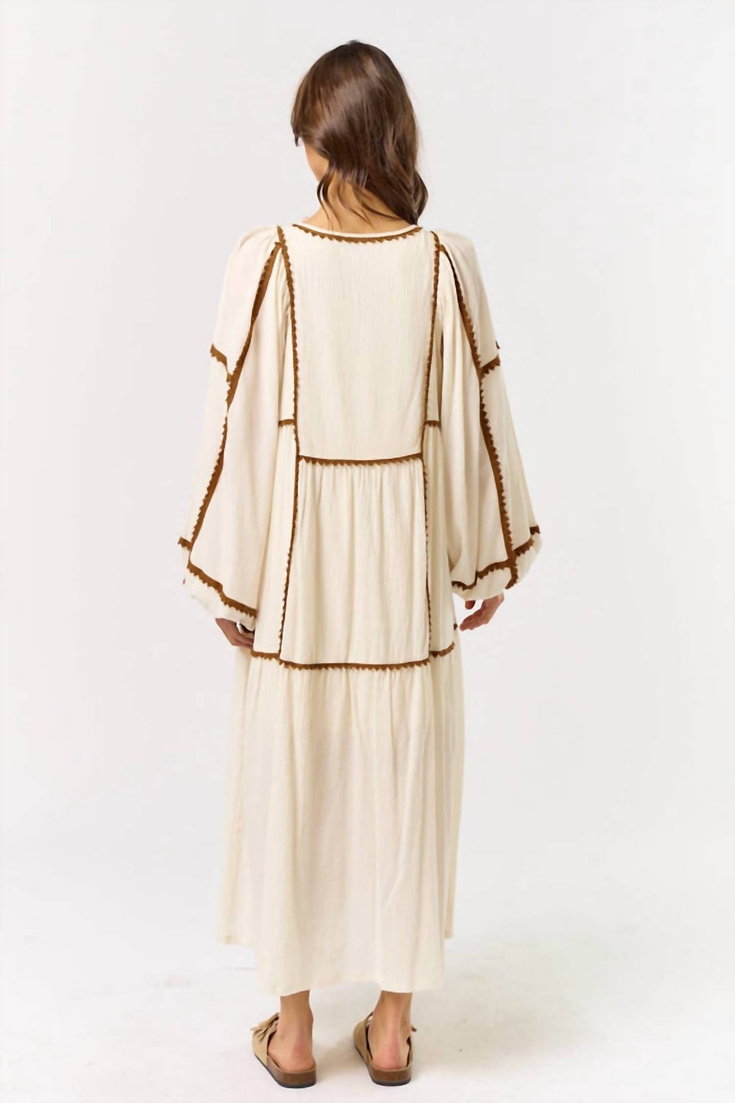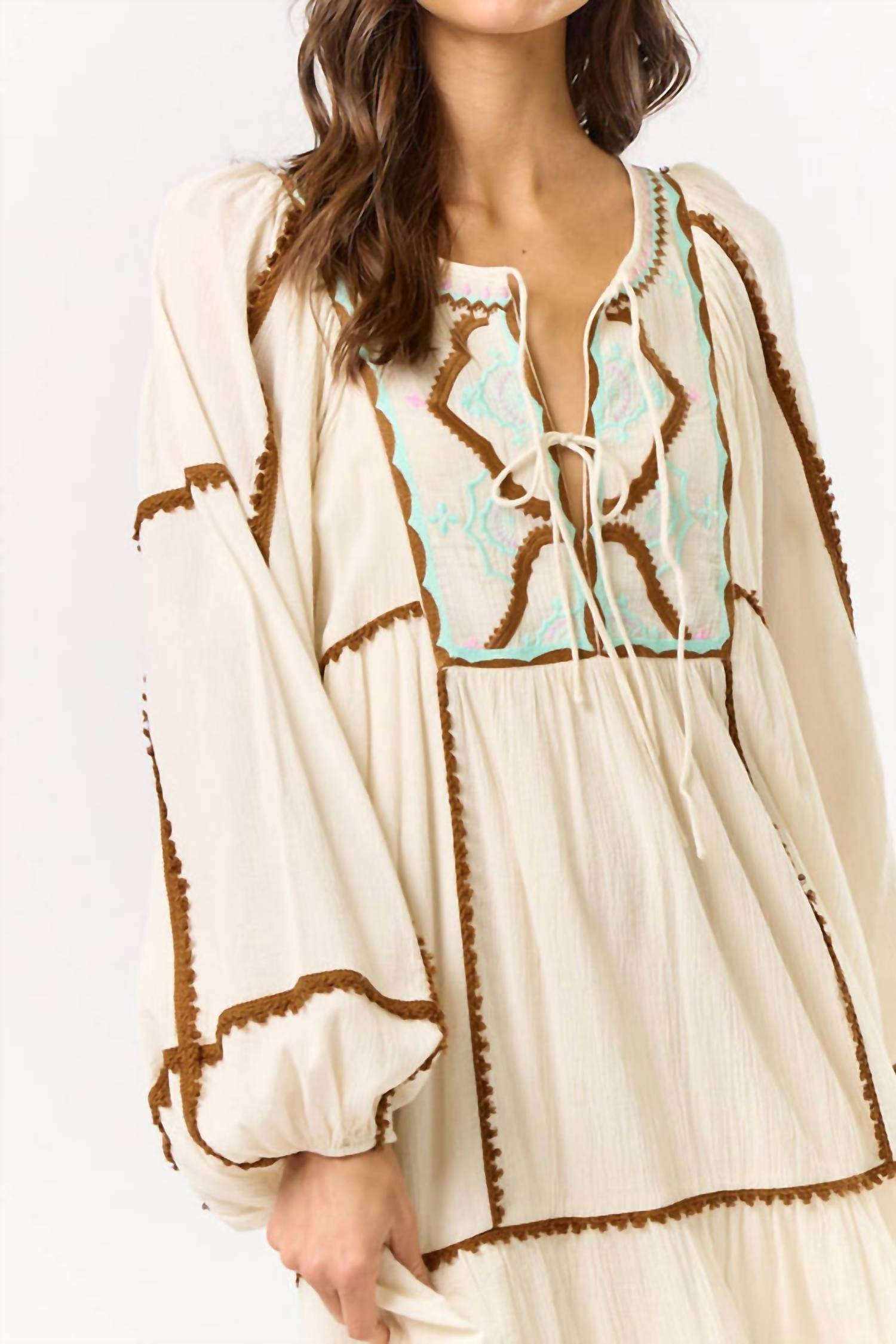 Style this maxi with your favorite statement necklace and sandals for the perfect look. Introducing the Lalavon Scandi Style Embroidered Maxi Dress, a beautiful blend of boho chic and timeless elegance. This maxi dress features long puffed sleeves and a flattering shift silhouette in a natural, feminine cotton fabric. It boasts intricate embroidery details in a '70s-inspired style, perfect for holiday parties or spring occasions. Closure: Tie closure. This beige, patterned dress adds a distinctly effortless beauty to any wardrobe.