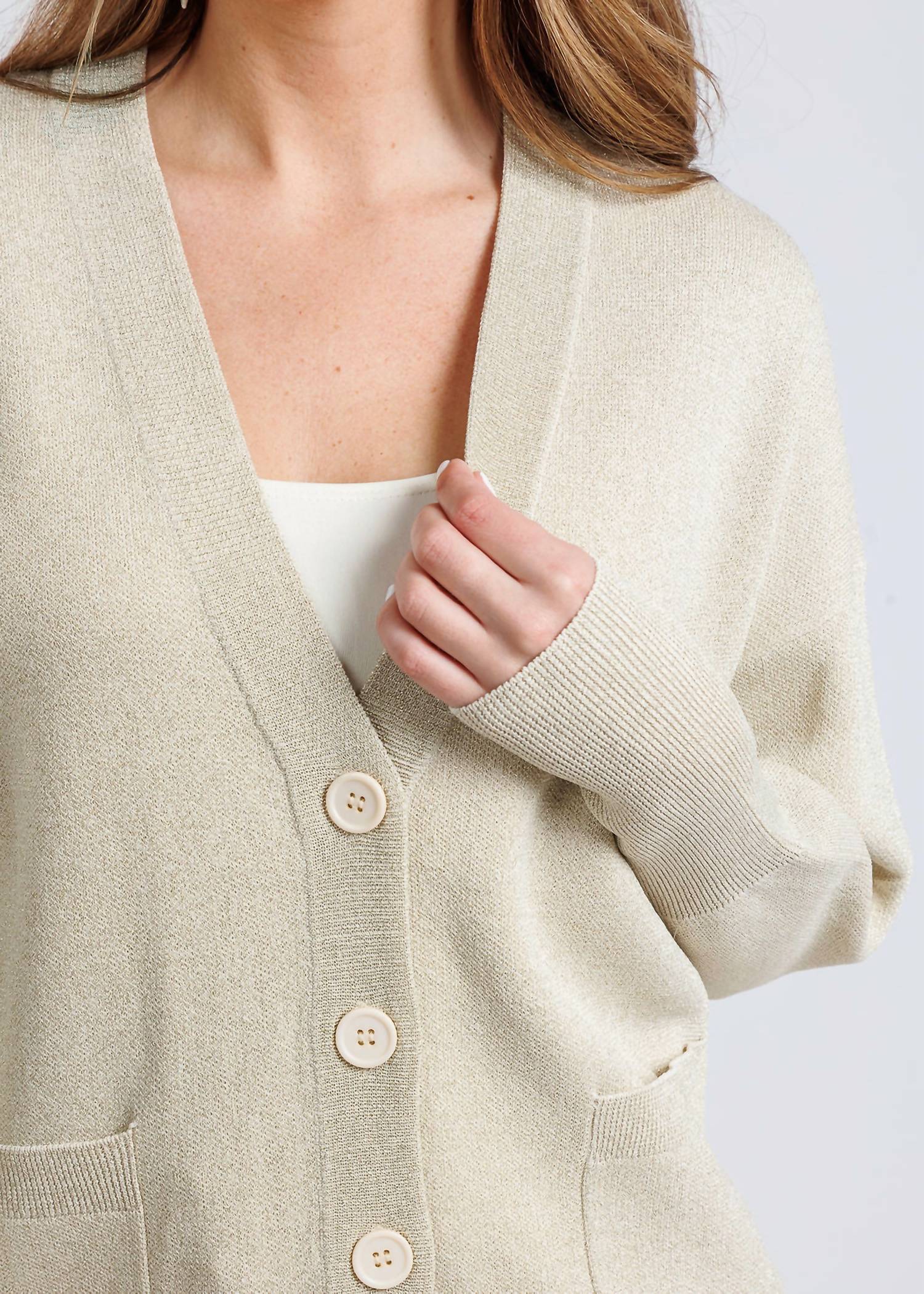 Um ajuste clássico que funciona tão bem abotoado quanto aberto. Uma mistura elegante de estilo e conforto, perfeita para viagens. Possui mangas compridas e um versátil decote em V, completo com fecho frontal por botões para facilitar o uso. Confeccionada em 51% Viscose, 28% Nylon e 22% Hilo Metalizado. O design em malha oferece um brilho sutil. As instruções de cuidado sugerem lavagem à mão para manter sua aparência elegante. A modelo está vestindo tamanho P/M (1,68 m de altura, 86 cm de busto, 72 cm de cintura, 79 cm de quadril, 73 cm de costura interna).
