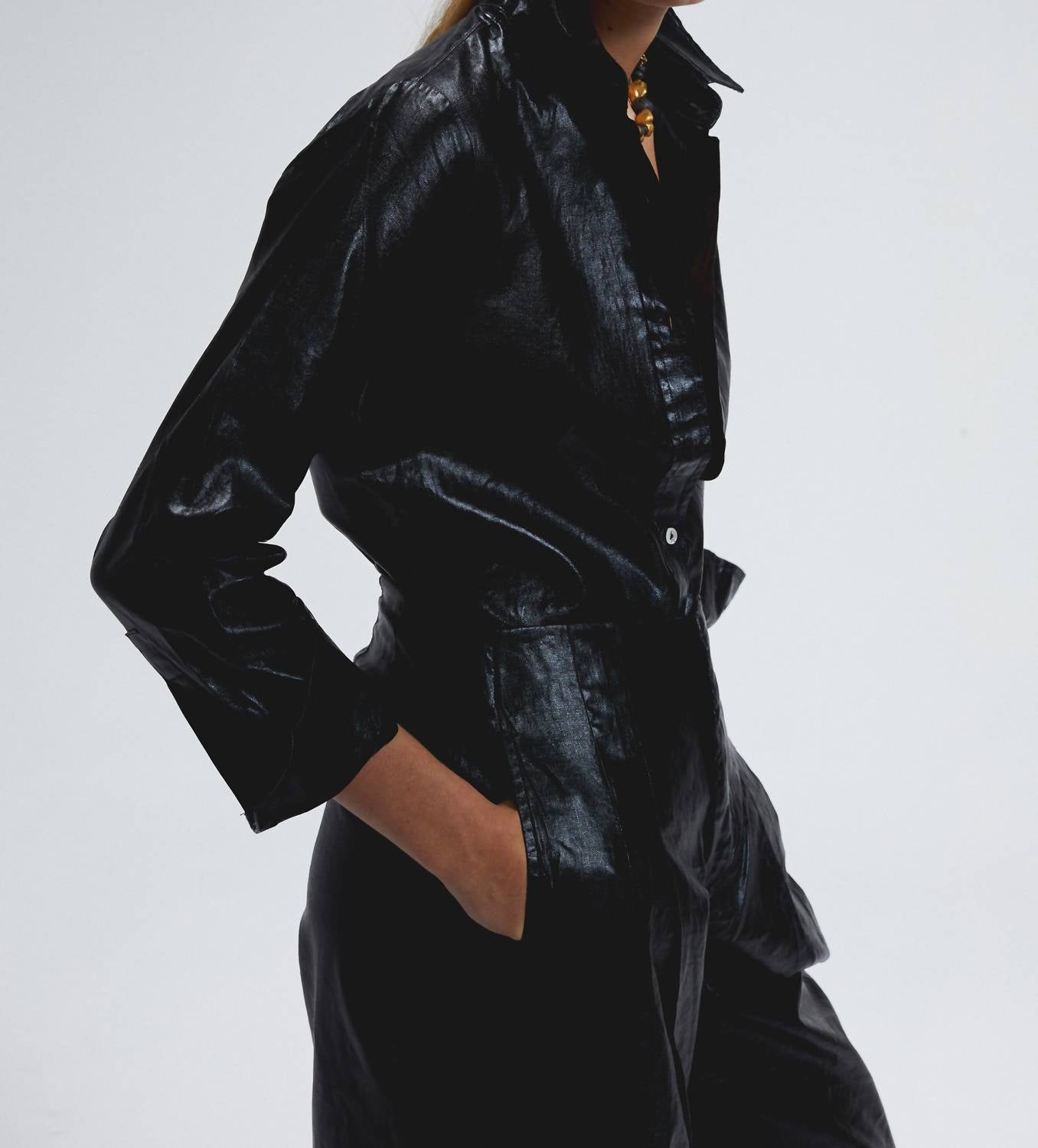 A long sleeve top you can wear with denim, skirts, well... just about anything! Elevate your style with the San Marino Metallic Linen Shirt by Lanhtropy, a stunning statement piece in black. This women's shirt features long sleeves and a classic collar with a chic curved hemline that is longer at the back, providing a flattering silhouette. Made from premium 100% organic linen with a metallic foil print, its button closure ensures ease of wear. Perfect for a dinner party this fall, this shirt embodies a 90s fashion trend with its unique design.