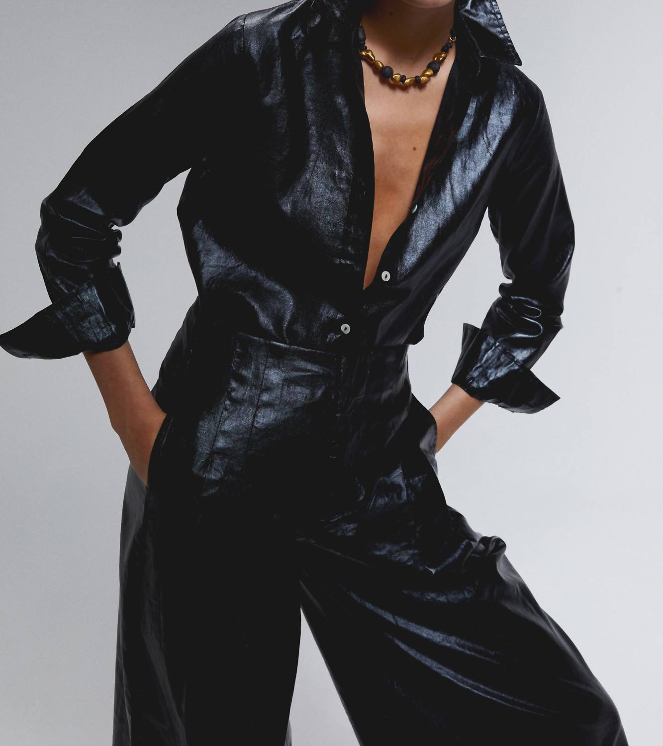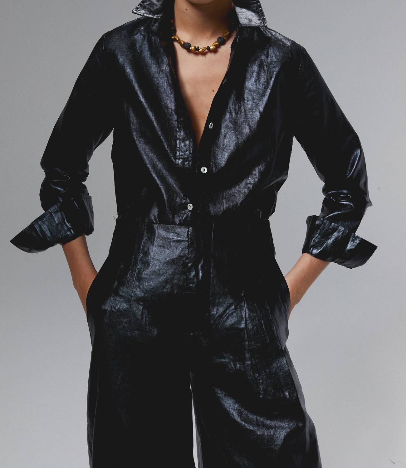 Elevate your style with the San Marino Metallic Linen Shirt by Lanhtropy, a stunning statement piece in black. This women's shirt features long sleeves and a classic collar with a chic curved hemline that is longer at the back, providing a flattering silhouette. Made from premium 100% organic linen with a metallic foil print, its button closure ensures ease of wear. Perfect for a dinner party this fall, this shirt embodies a 90s fashion trend with its unique design.