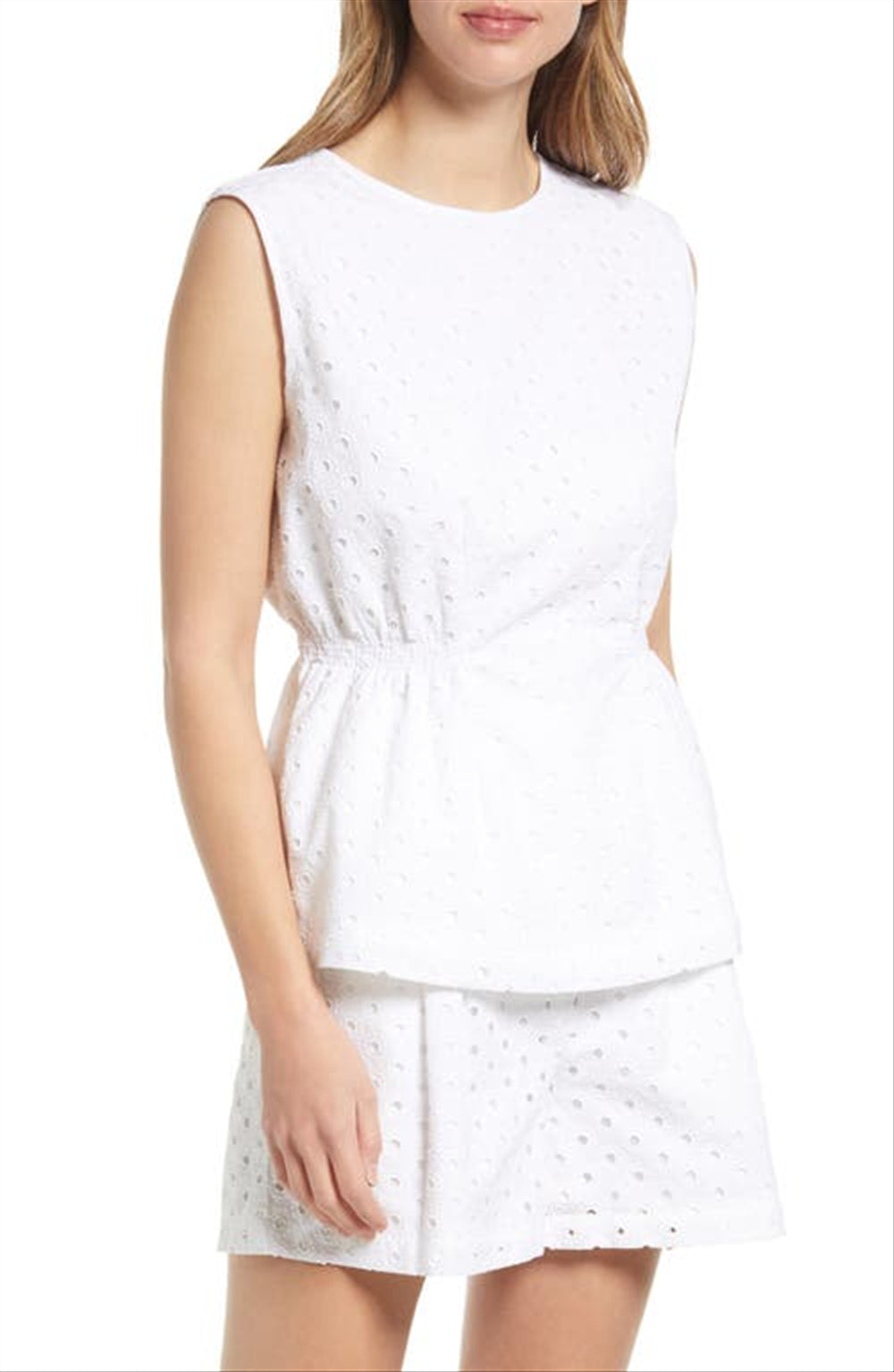 Blusa com detalhes em ilhós | Cor branca | Design franzido na cintura | Tamanho grande | Marca Halogen | Outlet Nordstrom | Material leve | Mangas compridas | Decote redondo | Tecido respirável | Design semitransparente