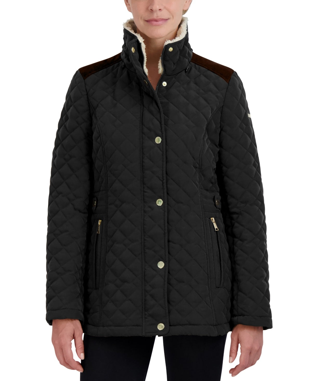Casaco acolchoado com capuz e forro de pele sintética Laundry By Shelli Segal feminino, preto, tamanho pequeno