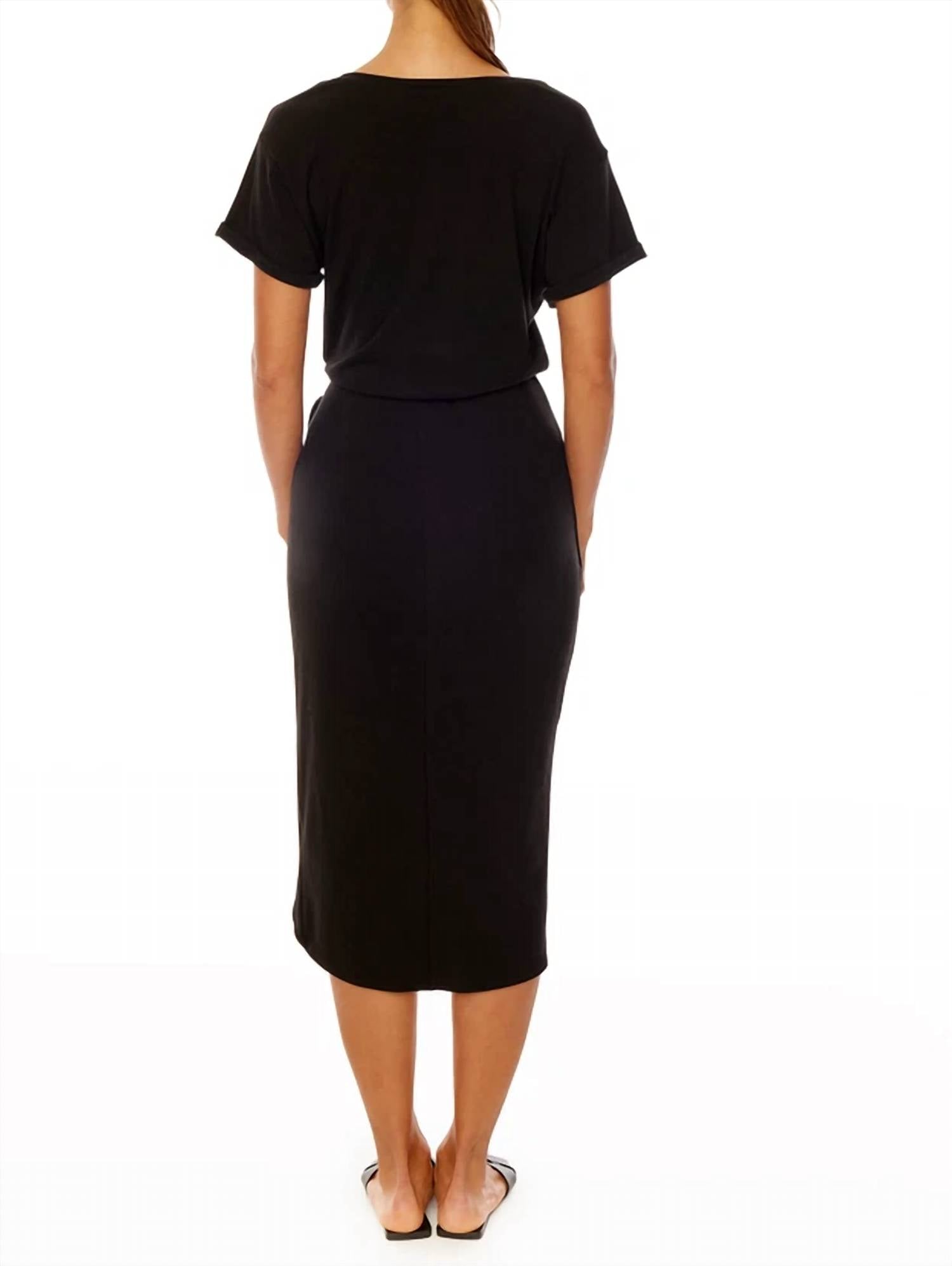 Just add slides or mules and you are good to go. Introducing the Kelly Wrap Dress by LBLC THE LABEL, a chic black piece perfect for a dinner party. This solid dress features short sleeves and a boat neck, offering a minimalist silhouette with its midi length and playful tulip hem. Made from a soft blend of 65% polyester, 26% rayon, and 9% spandex, it is designed for comfort and elegance. Gently hand wash in cold water and line dry. Ideal for Thanksgiving and Fall occasions.