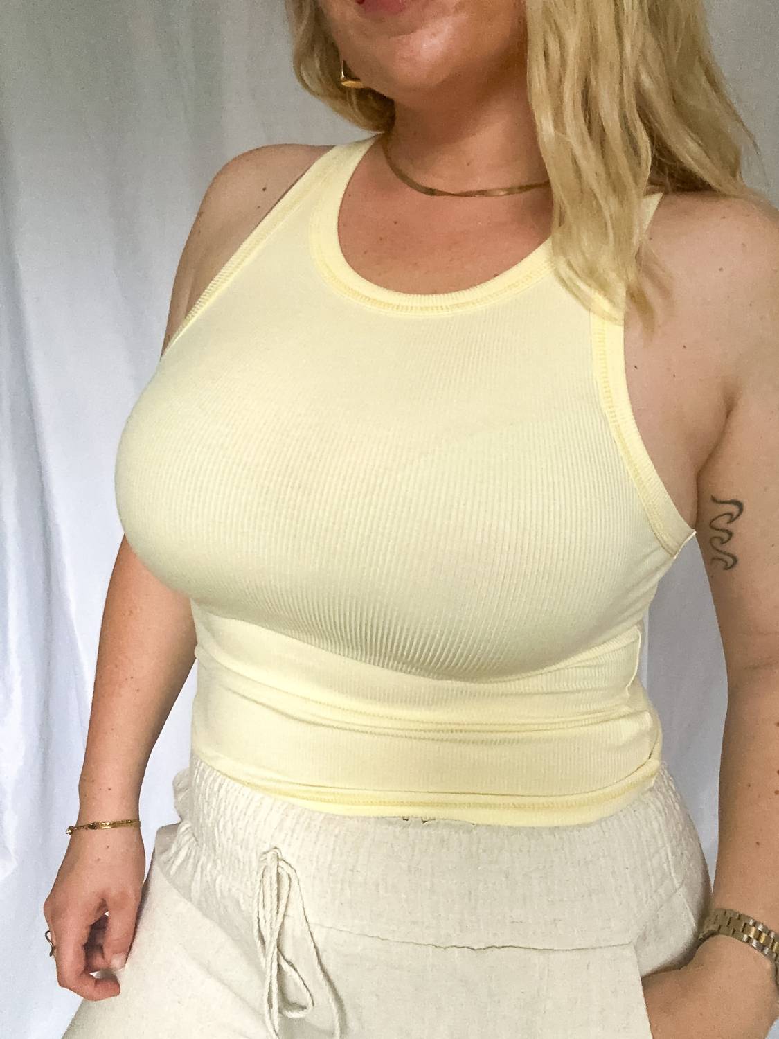 Eleve seu guarda-roupa de verão com a Regata Feminina Costura Costurada Coastal Stitch da LE LIS, um item essencial em amarelo vibrante. Esta regata cropped sem mangas apresenta gola careca e detalhes texturizados de costura invertida para um toque de estilo. Confeccionada em 92% rayon e 8% elastano, oferece conforto ultramacio com ampla elasticidade, ideal para dias de praia ou passeios casuais. Fecho: estilo pull-on. Disponível nos tamanhos XS a GRG, garantindo um ajuste perfeito.