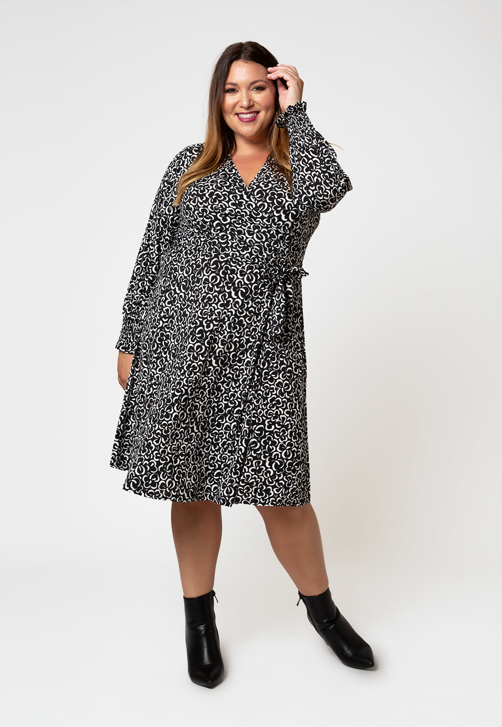 Manga blusão | Silhueta ajustada e evasê | Decote em V | Detalhe de amarração na cintura