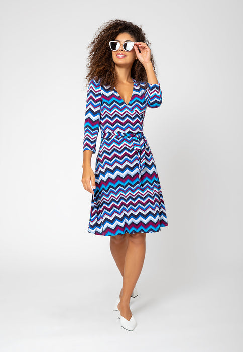 Chamamos isso de Vestido Envoltório Perfeito porque | bem | é | O estilo falso envolvente e a bainha na altura do joelho dão a você a liberdade de se mover - esteja você correndo atrás do dinheiro | das crianças | ou do sol