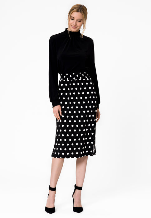 A saia Tessa deveria ser chamada de saia "relaxe porque eu sei que sou estilosa do jeito Alexa Chung" | Esta saia na altura da panturrilha é basicamente uma versão mais feminina e descolada da sua fiel calça de moletom | Estampa de bolinhas ousada (ok, talvez calças de moletom geralmente não sejam de bolinhas) | Cintura elástica confortável | e fica ótima com tênis e um moletom cropped | Ah, e como sempre