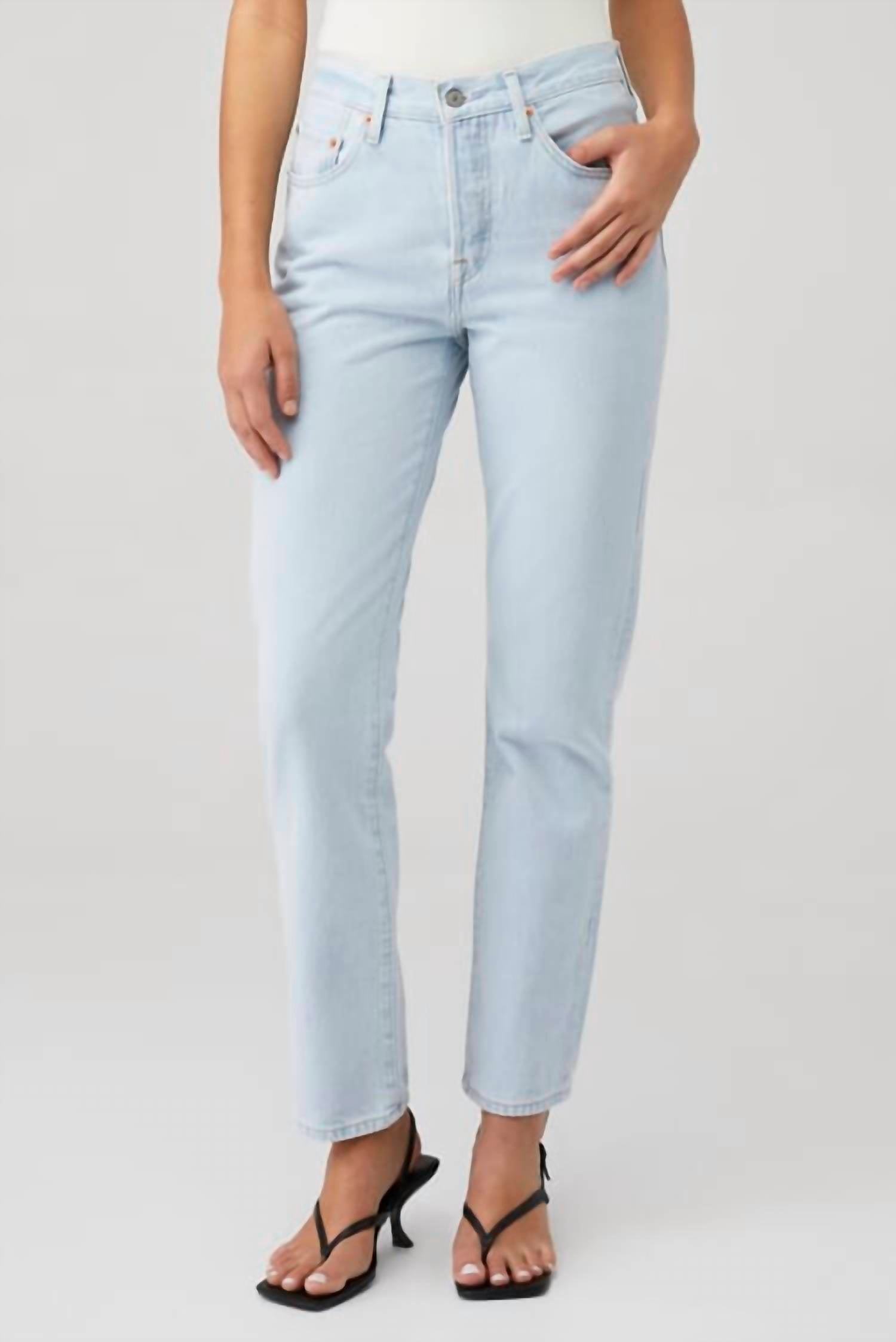 Step into timeless style with the 501 Jean by LEVI'S, designed for women who appreciate classic fashion. This high-rise, straight-leg jean comes in the Ice Cloud color, showcasing a light wash that's perfect for embracing 90s fashion trends. It is crafted from a cotton blend with a solid pattern, featuring a zip closure and functional pockets. Easy to care for, this jean is machine washable and can be tumble dried, making it a practical addition to your travel wardrobe.