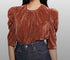 Blusa feminina LEYDEN de veludo amassado com manga bufante, marrom, tamanho pequeno