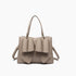 The Women's Jenna Bow Vegan Satchel Crossbody Bag by Like Dreams in taupe is a must-have accessory for modern versatility. Crafted from sleek, premium vegan leather, this bag offers gold hardware detailing and features three compartments, including a zipper pouch divider. It includes a top handle with a 6 1/2" drop, and a 24" adjustable and detachable strap, making it adaptable for various wearing styles. Secured with a zipper opening and two magnetic snap closures, this chic satchel measures 11"W x 8"H x 5 1/2"D and weighs 28.17 oz.