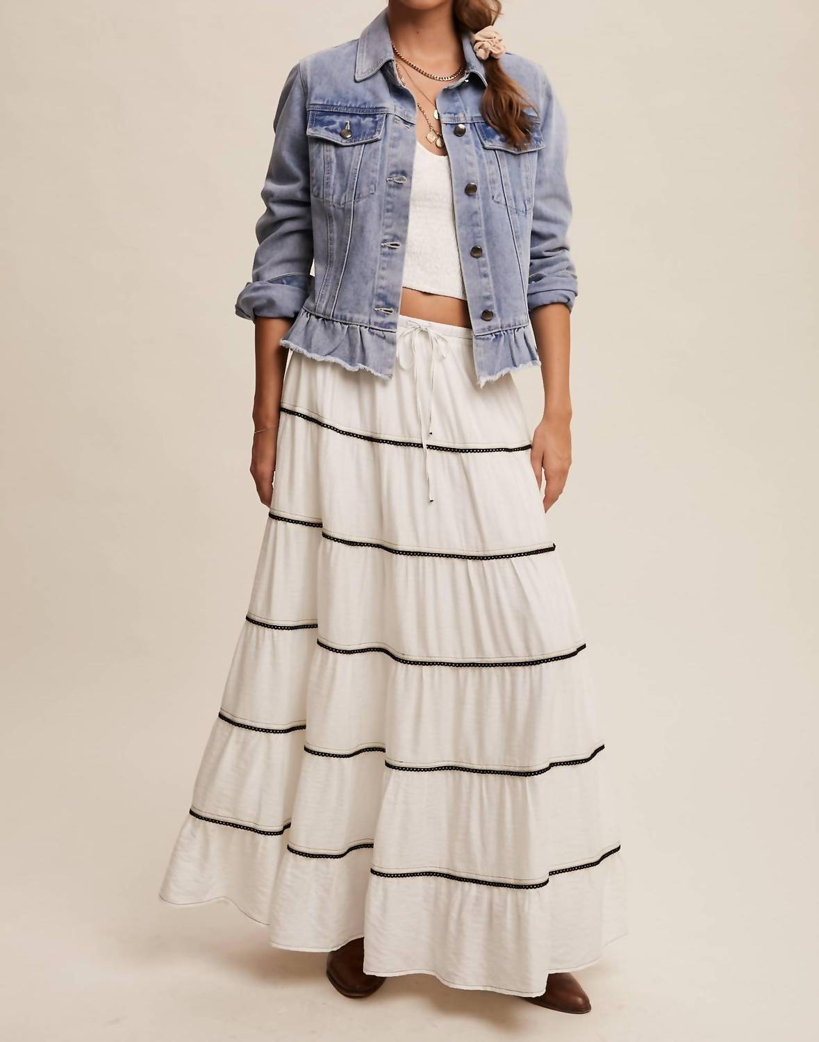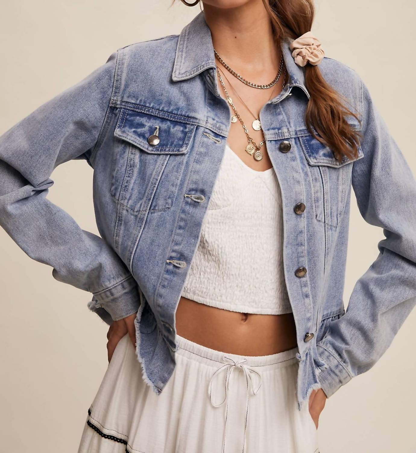 Embrace a feminine twist on a classic with the Ruffled Hem Denim Jacket by Listicle in Light Denim. This solid-pattern jacket features long sleeves with adjustable buttoned cuffs, crafted from soft, faded denim with a vintage-inspired wash. Its classic collared neckline complements the playful ruffled hem and functional chest flap pockets, all secured with a sturdy button closure. Ideal for layering, this unlined piece offers a stylish, comfortable option for any spring wardrobe. Model is 5' 7.5" with measurements 33-24-34, wearing a size Small.