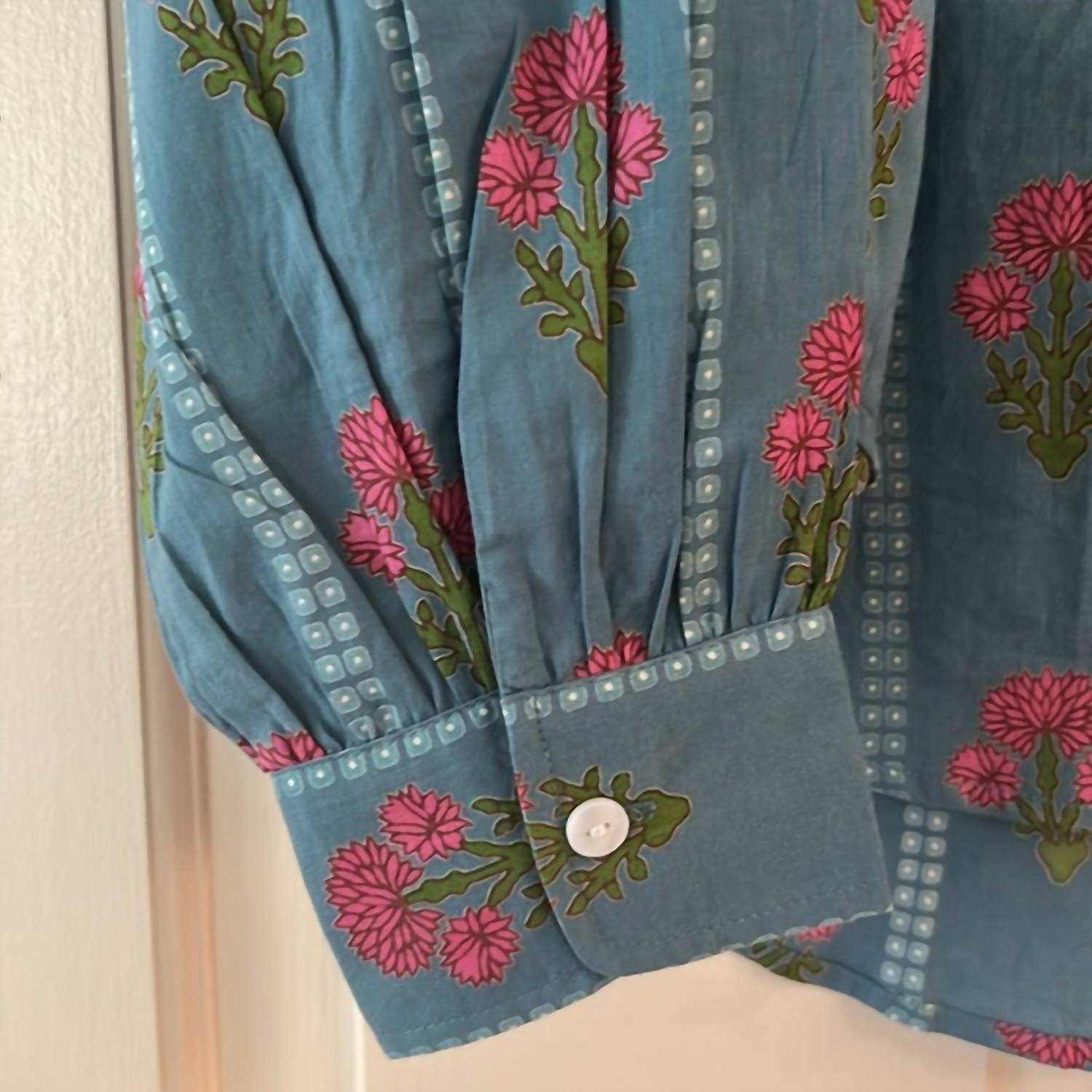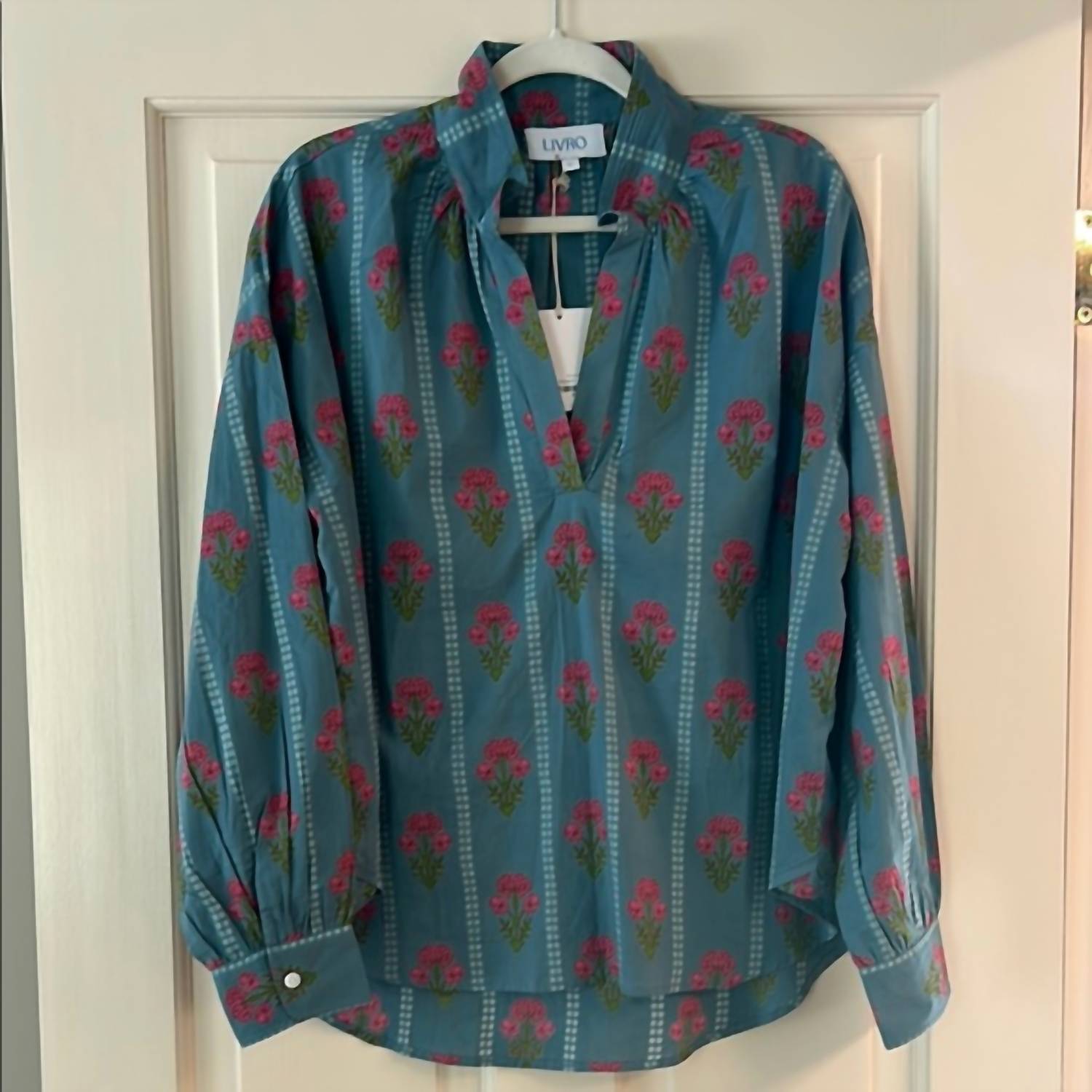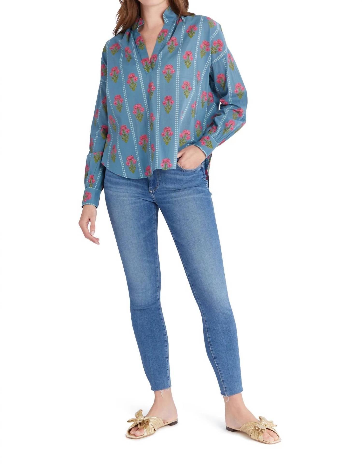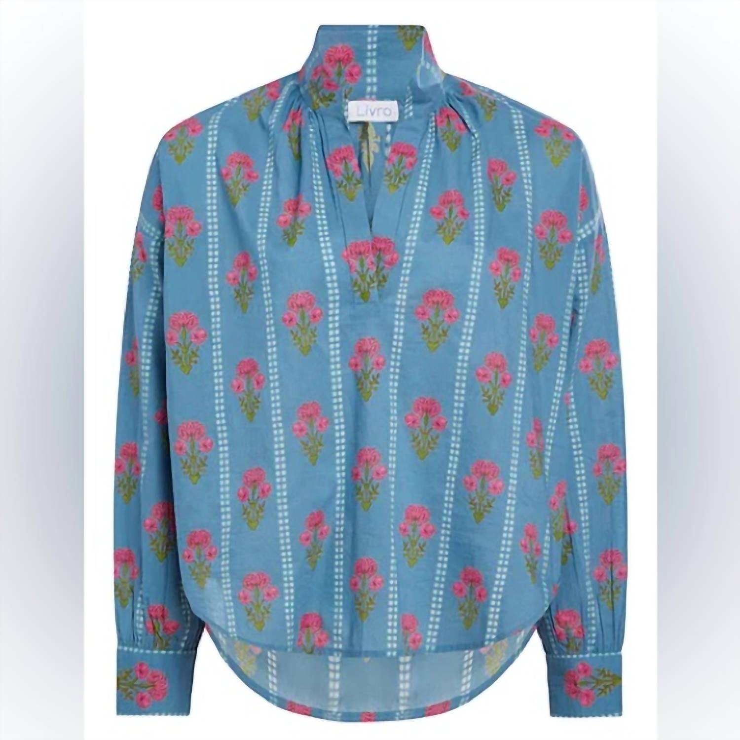 A versatile blouse that works from desk to dinner! Introducing the Jane Top by Livro in a charming Bouquet Stripe floral pattern, an essential addition to your wardrobe. This blouse features long sleeves, a flattering split V-neckline, and a standing collar, designed for a versatile, relaxed fit that is shorter in front. Made from 100% cotton and crafted with high-quality standards in Jaipur, India, it offers both comfort and style. With a convenient pull-on closure, this top requires a gentle care routine to maintain its boho chic appeal.