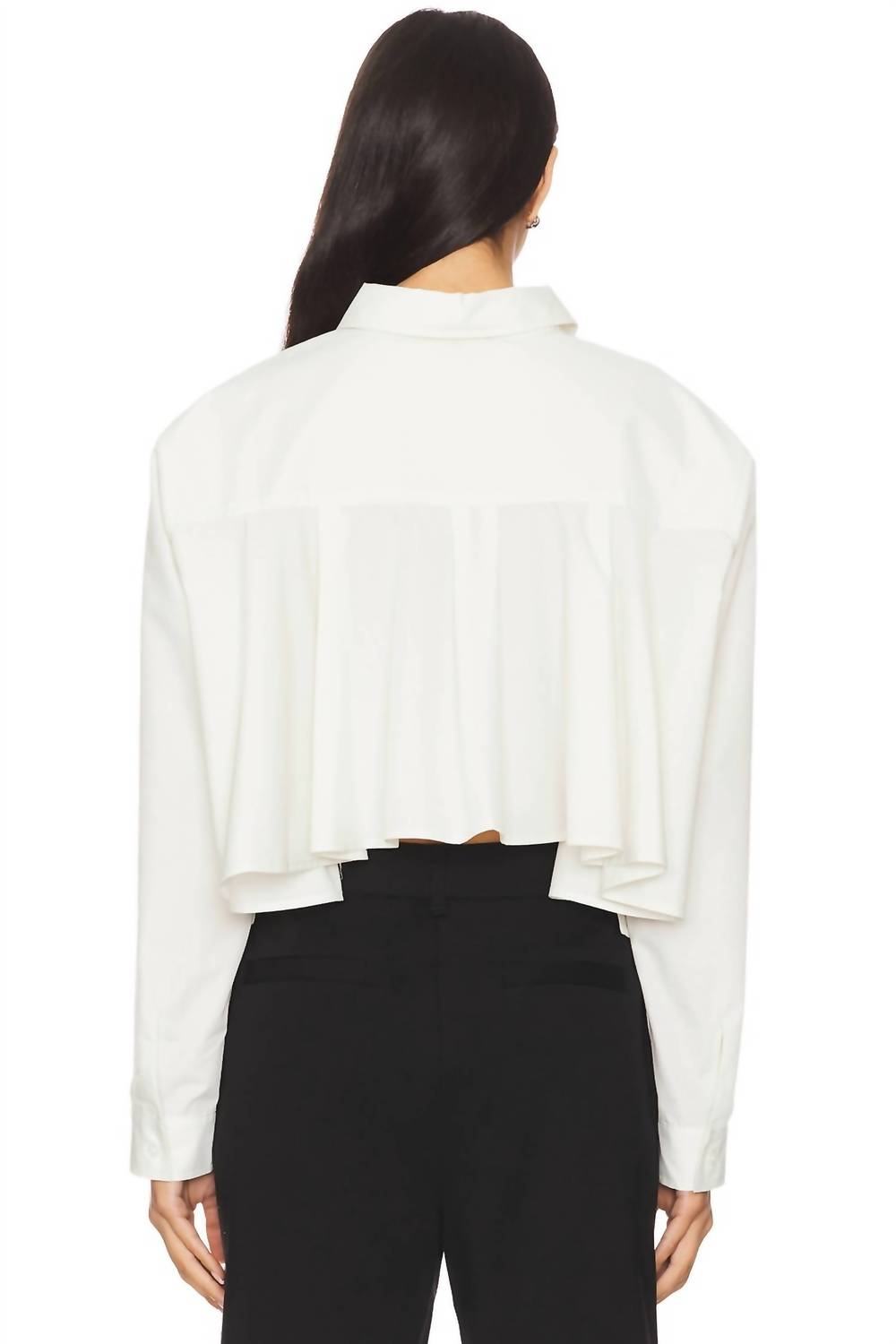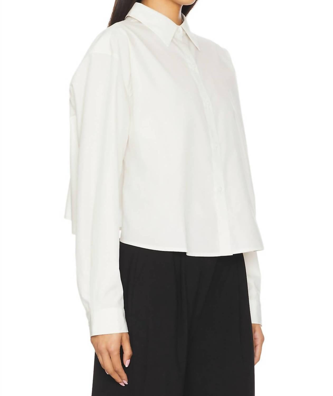 A versatile blouse that works from desk to dinner! Introducing the Valyria Shorter Pleated Back Blouse by LNA in a chic Vapor colorway, perfect for elevating your workwear wardrobe this spring. This long sleeve blouse features a classic collar and button closure, with the unique design of a shorter pleated back for added flair. Crafted from a blend of 90% Polyester and 10% Cotton, this piece is designed in Los Angeles with imported fabrics. Care instructions: Machine wash cold and tumble dry low.