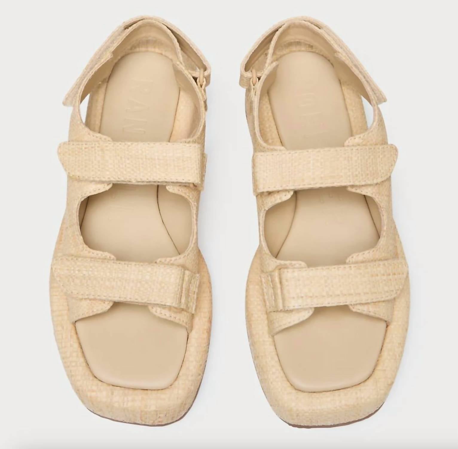 Meet the Women's Blaise Platform Sandal by Loeffler Randall, an ideal choice for a stylish summer outing. Crafted in natural raffia, this sandal boasts an upper of 100% raffia and a 100% rubber outsole. It features a sporty two-band design with adjustable Velcro straps, open toe, and an adjustable heel strap, all set on a 1.25-inch platform for added height and a chunky look. Perfect for streetwear trend enthusiasts, this sandal is a beach day essential.