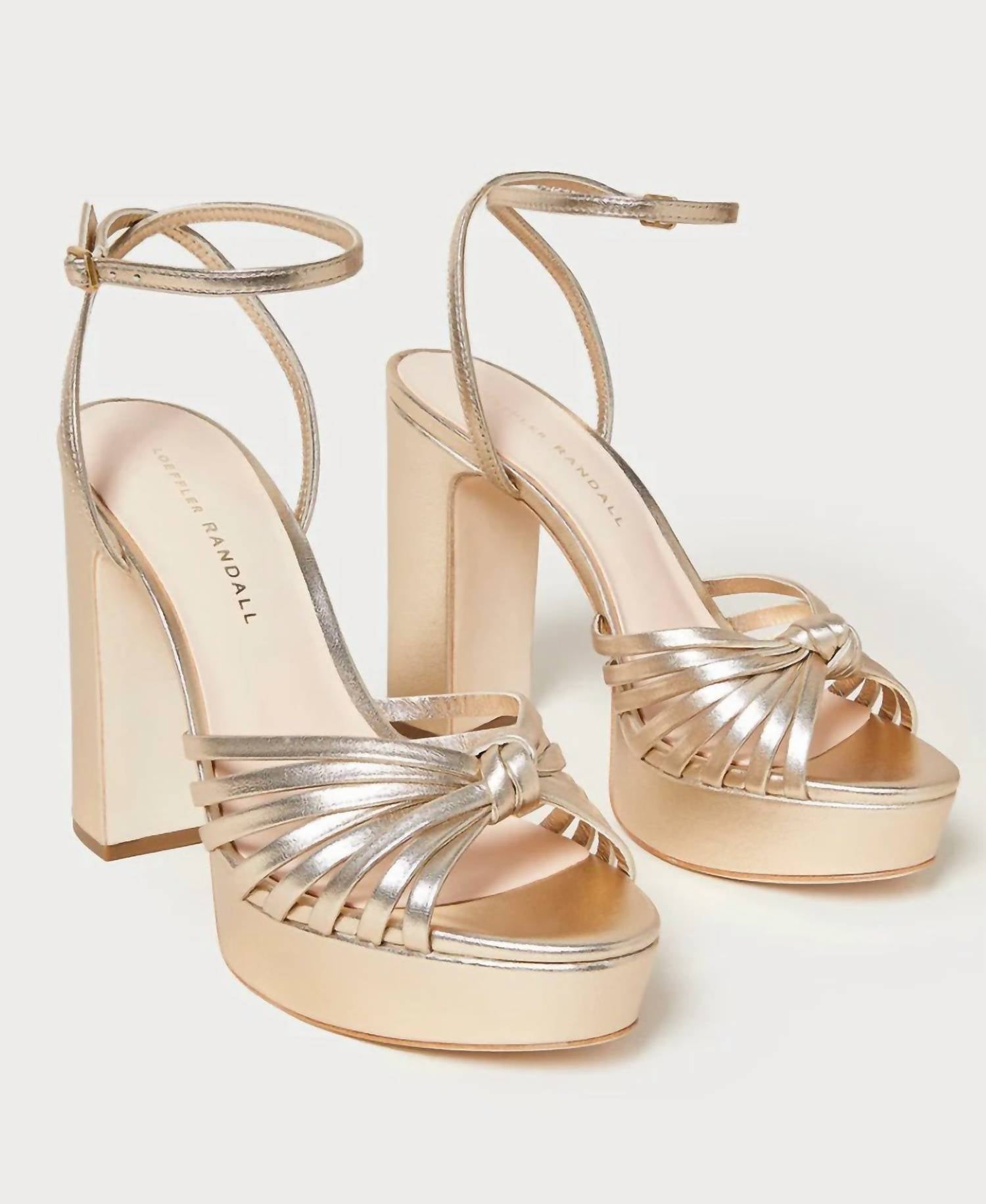 A altura perfeita para o dia e para a noite. Entre em sintonia com a elegância com a Sandália Plataforma Feminina Rivka Knot da Loeffler Randall em champanhe metálico. Confeccionadas em couro napa luxuoso, estas sandálias apresentam salto plataforma de 12,7 cm e plataforma de couro revestido de 8,9 cm para um salto alto com estilo sofisticado. Com tira mignon em peça única e tira ajustável no tornozelo com fivela, estas sandálias oferecem um ajuste perfeito para eventos noturnos. Observe o tamanho: este modelo veste um pouco mais estreito, então considere comprar meio número maior para pés mais largos. Cuide destes sapatos delicados evitando a exposição prolongada à água e procure um profissional para recondicionamento, se necessário.