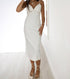 The Sydelle Dress by LoveShackFancy is a minimalist sheath dress perfect for summer cocktail parties. Featuring elegant spaghetti straps, this white dress is crafted from crisp linen fabric, providing both comfort and style. Its midi length is accentuated with a v-neck and scallop detailing, while a back slit and a faux bow add playful touches. Closure: Tie closure. Model Hannah is 5'8" and is wearing a size 4.