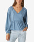 Lucky Brand Blusa de malha feminina com decote dividido e manga comprida, azul, tamanho médio