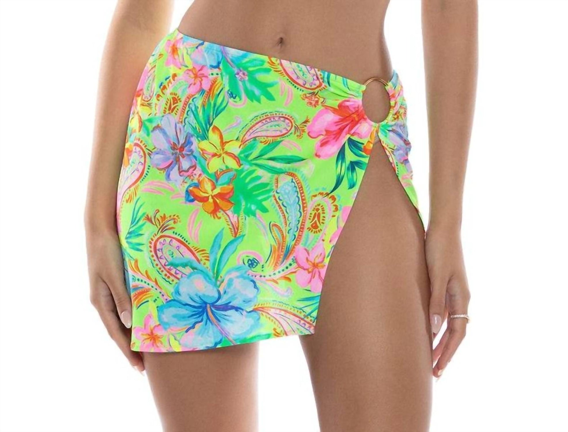 Embrace vibrant style with the Luli Fama Hibiscus Dream Ring Cover Up Mini Skirt, perfect for a summer beach day. This boho chic coverup features a playful floral pattern in multi colors, accented by a side slit and ring-side detail, all on a comfortable elastic waistband. Crafted from 100% Polyamide, this women's skirt offers full coverage. Care: Hand wash and line dry. Prints may vary for a unique touch.