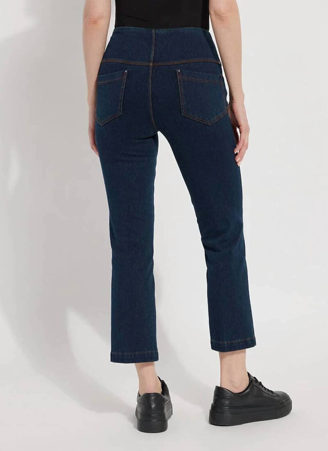 The trend report says boot-cut is in and that's exactly why we love this style. They are fit to perfection, flattering on any body type, and comfortable. They will be your go-to all season long. Embrace effortless style with the Ankle Baby Bootcut Denim Pant by Lysse, ideal for shorter women craving comfort and flair. Featuring a dark indigo hue, these bootcut pants are crafted from 95% Cotton and 5% Spandex knit denim with 4-way stretch for ultimate comfort. At 27 inches, the mid-rise design sports an inseam suitable for a full-length fit under 5'7" and a chic cropped look at 5'8", along with back patch pockets accentuated by metal grommets. Boasting a concealed patented 360 smoothing waistband, these pull-on jeans offer a flattering fit that skims the hips and thighs before gracefully flaring out. Care instructions: machine wash and line dry.