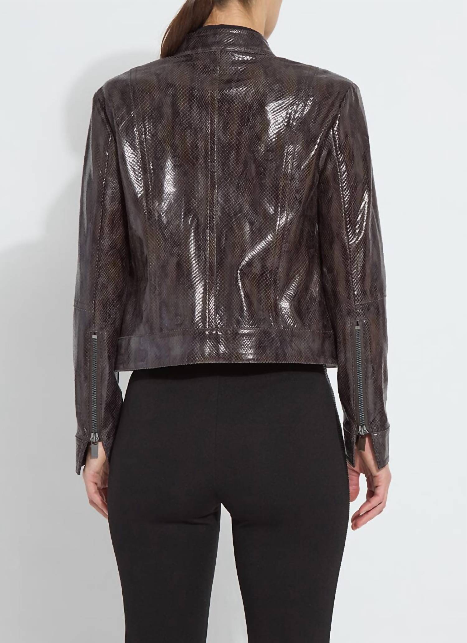 Couro macio, design impecável. Esta jaqueta de couro é uma aposta ganha-ganha. Eleve sua coleção de agasalhos com a Jaqueta Bennett de Couro Vegano Envernizado da Lysse, com um marcante padrão Liquid Mocha Snake. Esta peça versátil possui mangas longas e é confeccionada em 90% poliéster e 10% elastano para um ajuste confortável e flexível. Desenhada com bolsos frontais e zíperes robustos em metal, ela combina estilo com praticidade. Fechamento: Fecho de pressão. Cuidados: Lavar à máquina e secar no varal. A modelo tem 1,78 m e veste tamanho P.
