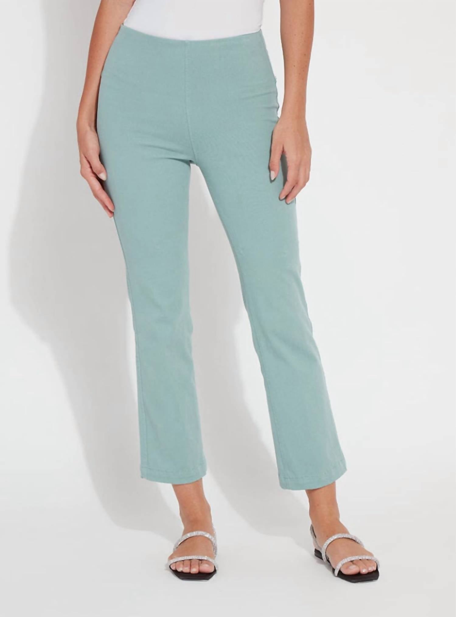 Introducing the Cropped Baby Bootcut Ankle Denim Pants by Lysse in a chic Morning Blue, designed for shorter women with a regular fit. These pants feature a 27-inch inseam, slight leg flare, and mid-rise waist, made from a comfortable 95% Cotton and 5% Spandex blend. With a zip closure and back pockets, they offer both style and practicality. Designed in a minimalist, solid pattern, these bootcut ankle-length pants are perfect for a vacation or celebrating St. Patrick's Day. Care for them with a simple machine wash.