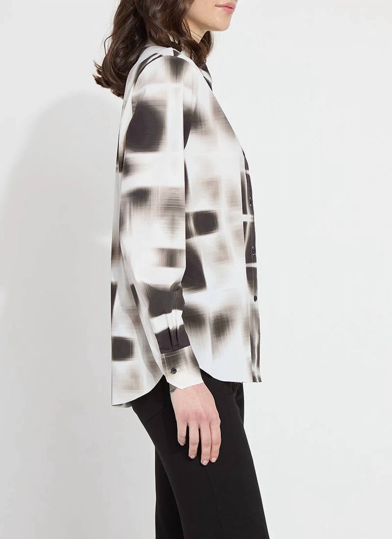 Perfeitamente ajustado e macio ao toque. A Camisa Slim Fashion Connie da Lysse é a combinação perfeita de estilo e praticidade, com um design estampado moderno em Soft Shadow. Com mangas compridas e fecho de botão, esta camisa na altura do quadril ostenta uma bainha curva exclusiva, sendo mais longa nas costas para um toque de estilo. Confeccionada com uma mistura de 75% nylon e 25% microfibra spandex, seu material elástico em 4 direções, resistente a rugas, promete conforto e durabilidade. Fácil de cuidar, basta lavar na máquina e secar no varal. A modelo tem 1,78 m e veste tamanho P.