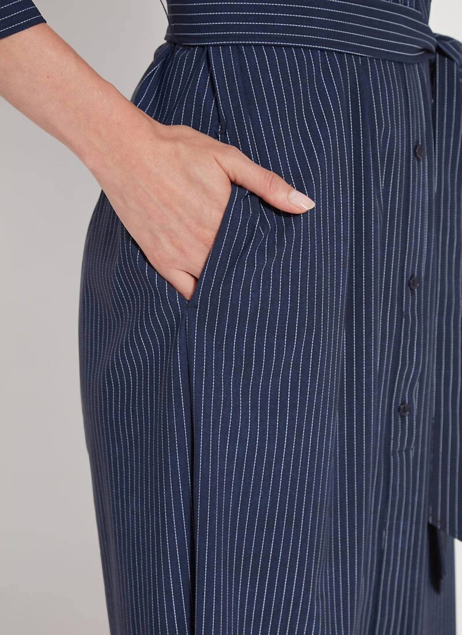 O Vestido Schiffer da Lysse em Ultimate Navy combina funcionalidade e estilo com naturalidade, sendo perfeito para o trabalho, viagens e eventos sociais. Este vestido com estampa listrada apresenta mangas três quartos e um corte de camisa com gola clássica e bolsos laterais funcionais. Confeccionado em microfibra elástica em 4 direções, com composição de 75% nylon e 25% elastano, oferece um caimento perfeito e bainha arredondada na altura do joelho, com acabamento em viés. Com fecho de botão e lavagem à máquina e secagem no varal, o vestido também inclui um cinto removível e costas com pala dupla e prega profunda para maior sofisticação. A modelo tem 1,78 m e veste tamanho P.