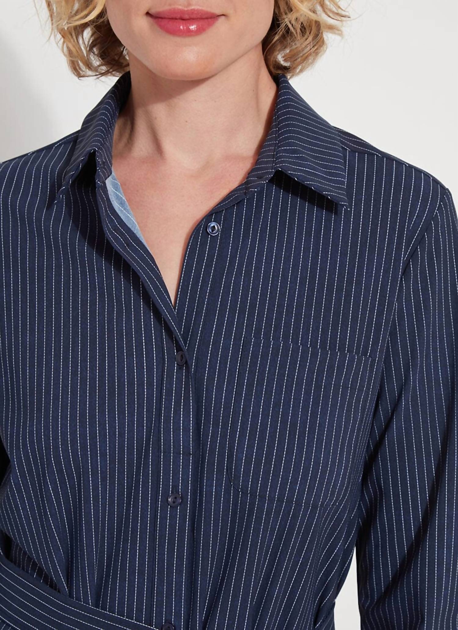 O tipo de vestido fácil e elegante que você vai usar durante toda a estação. O Vestido Schiffer da Lysse em Ultimate Navy combina funcionalidade e estilo com naturalidade, sendo perfeito para o trabalho, viagens e eventos sociais. Este vestido com estampa listrada apresenta mangas três quartos e um corte de camisa com gola clássica e bolsos laterais funcionais. Confeccionado em microfibra elástica em 4 direções, com composição de 75% nylon e 25% elastano, oferece um caimento perfeito e bainha arredondada na altura do joelho, com acabamento em viés. Com fecho de botão e lavagem à máquina e secagem no varal, o vestido também inclui um cinto removível e costas com pala dupla e prega profunda para maior sofisticação. A modelo tem 1,78 m e veste tamanho P.